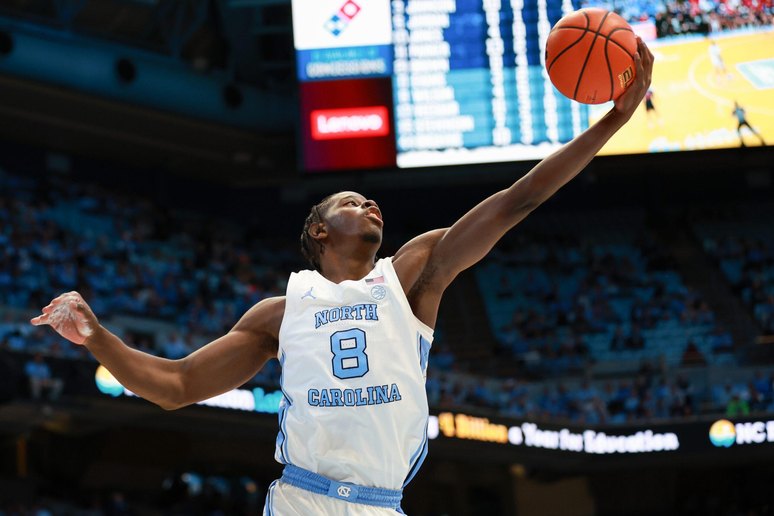 Caleb Wilson collects a rebound during a game between the North Carolina Tar Heels and the Radford Highlanders