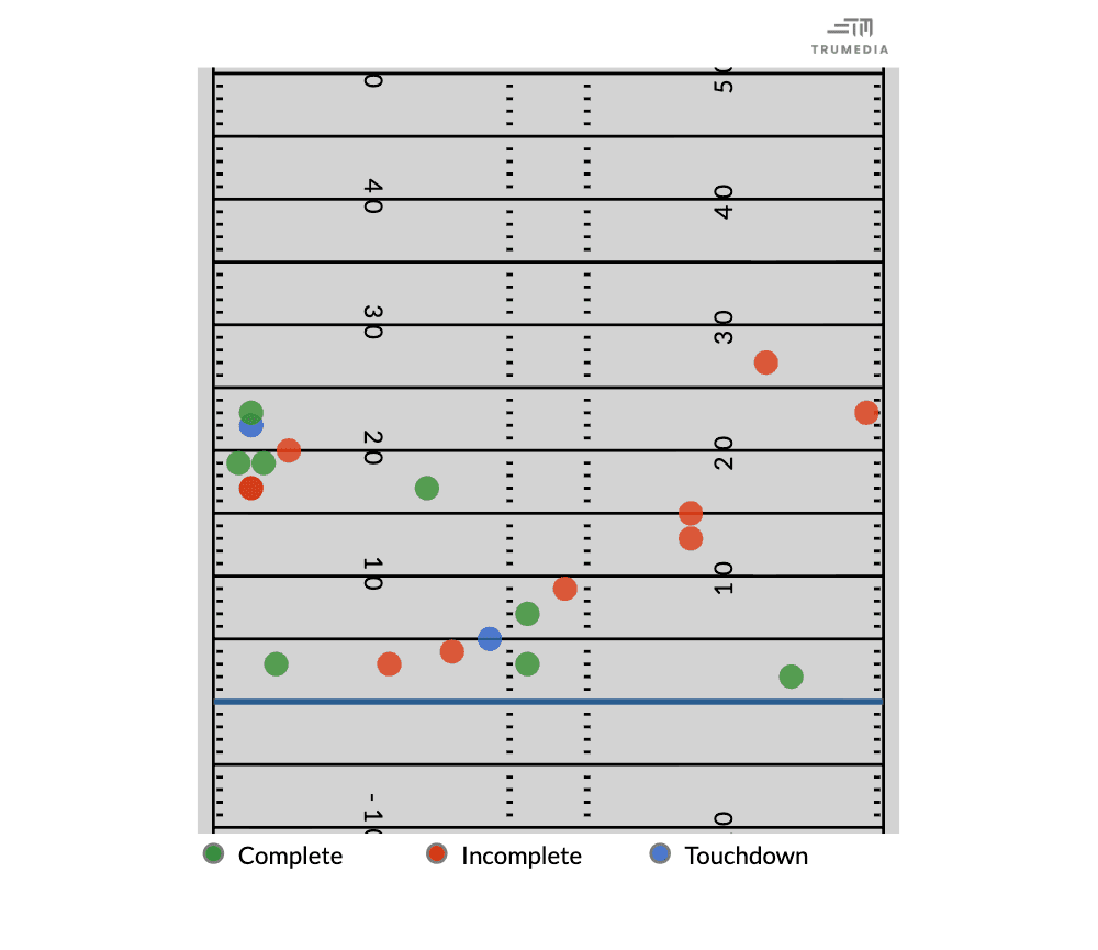 And the Bears needed every one of them. This is being framed as some great collapse by the Packers, but they provided Chicago with no margin for error in the fourth quarter by scoring a touchdown and holding the ball for 7:33 of game time. After settling for three points on the first drive of the final quarter, the Bears had to score touchdowns on their final three possessions … and quickly. The first of those touchdown drives lasted just over two minutes, the second took up 2:30 of the clock, and the third was just 68 seconds long. Caleb Williams wasn’t dinking and dunking his way down the field against a prevent defense. He was slinging it into the second and third levels of the coverage. Here’s his passing map from the fourth quarter, via TruMedia.