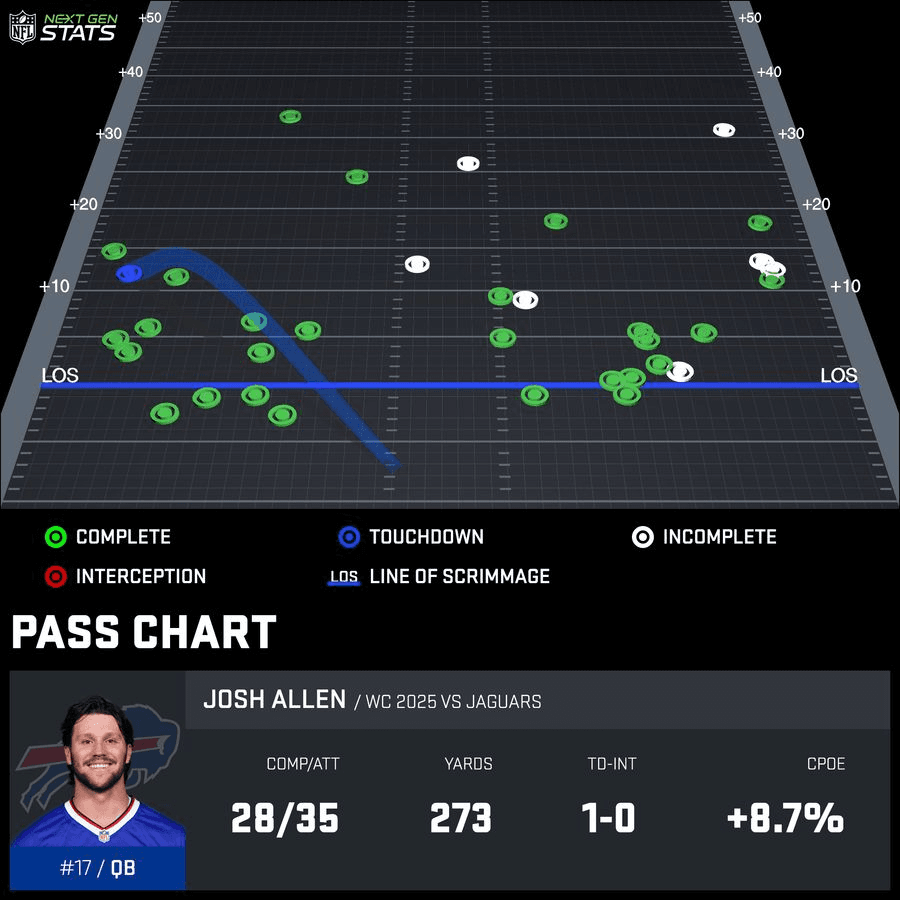 Allen won’t need any excuses this week after leading the Bills to a 27-24 win over the Jaguars in Jacksonville. This wasn’t his best postseason performance from a statistical standpoint. He went 28-of-35 for 273 yards and three touchdowns (two on the ground and one through the air). He’s put up numbers like that in a single half in his playoff career. But this still felt like a seminal moment for him given the current state of Buffalo’s roster. Allen couldn’t afford to make the one or two bozo plays he’s typically good for in a given week. Not against a well-rounded Jaguars team that looked on paper like a tricky matchup for the Bills. He didn’t log a single turnover-worthy play, per Pro Football Focus; had just two off-target throws on 35 attempts; and took only one sack despite being pressured on a third of his 39 dropbacks.