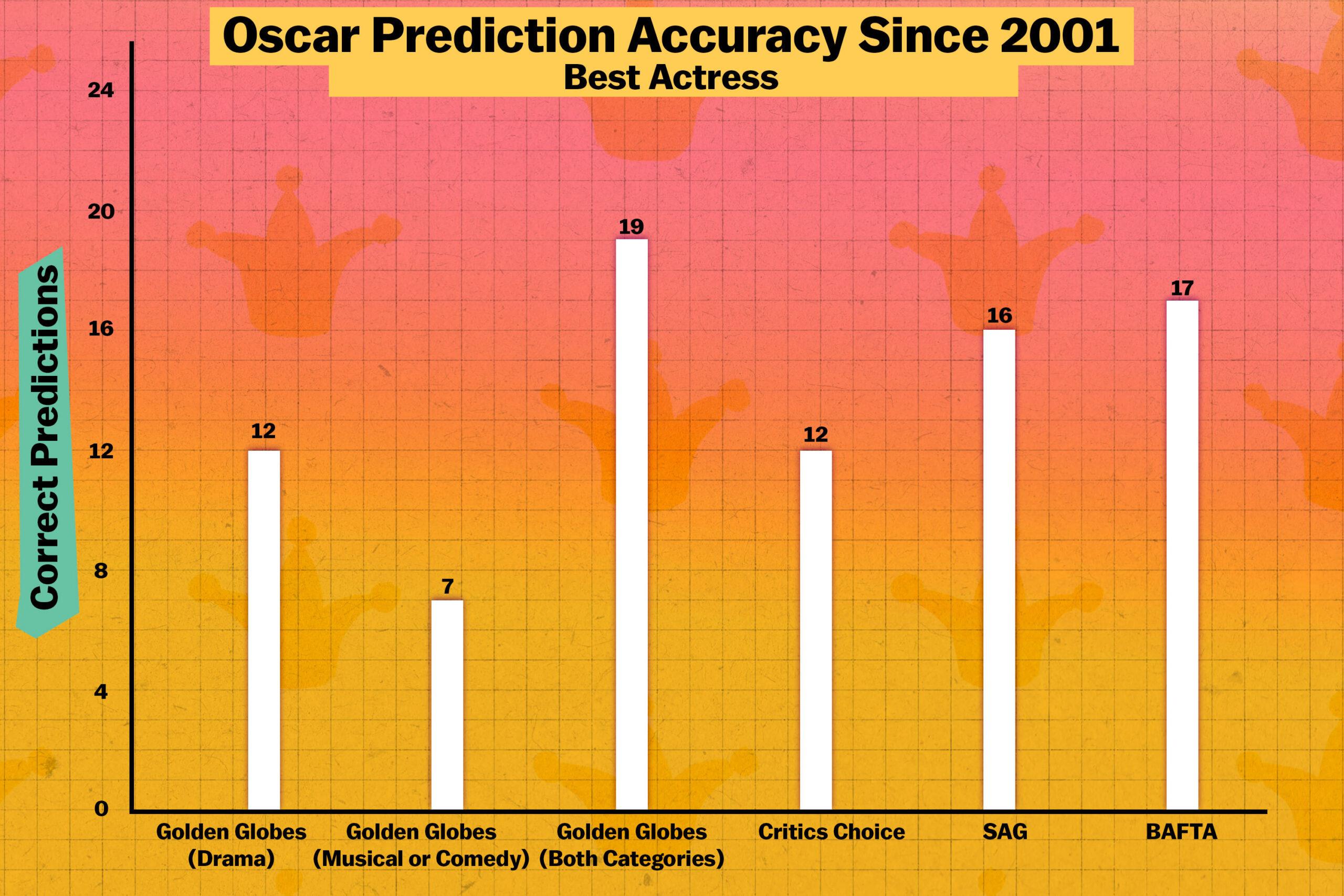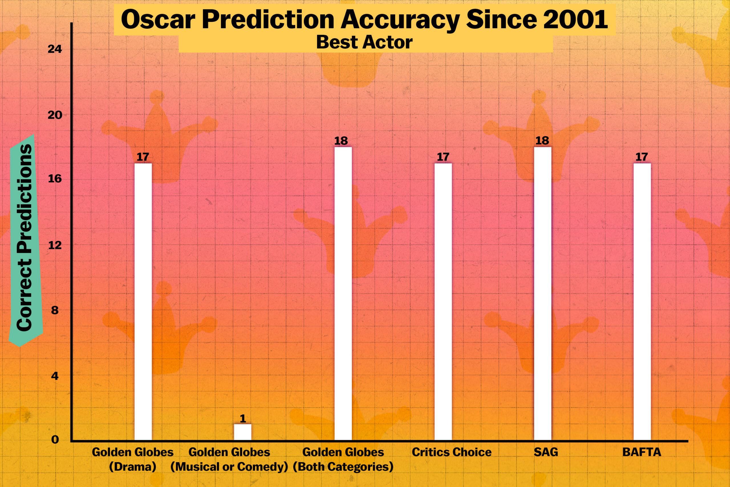 Analysis of the Best Actor data doesn’t reveal one particular awards show as a strong predictor. They all often get it right! That doesn’t necessarily mean these awards shows are aligned with each other every year—there have certainly been close races where the various preliminary awards were scattered. In 2023, for instance, Elvis’s Austin Butler snagged the Golden Globe and the BAFTA, while The Whale’s Brendan Fraser won the CCA and the SAG Award; Fraser ultimately won the Oscar. But overall, the awards ultimately even out to comparable accuracy across the board. But man, they really never give the Oscar to the Best Actor in a Musical or Comedy Golden Globe winner, huh? The only time it happened in our dataset was when Jamie Foxx nabbed both awards for Ray in 2005. Perhaps Timothée Chalamet, who just won that Golden Globe for Marty Supreme, can make it happen a second time?