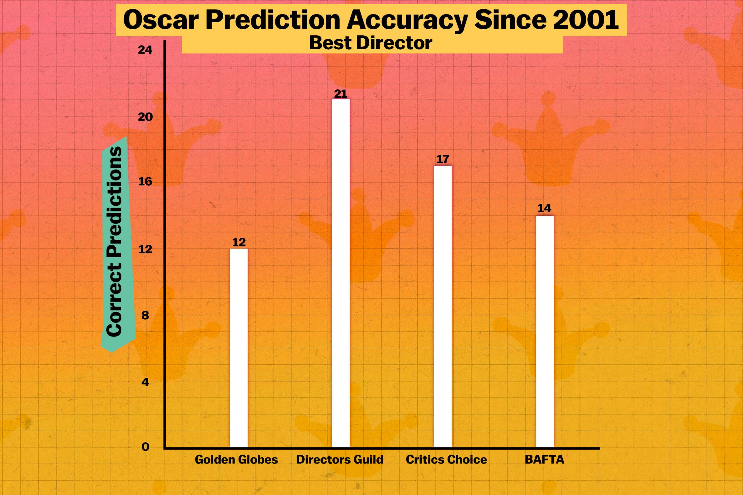 And now on to the single most accurate predictor on the major awards circuit: The winner of the DGA Award for Outstanding Directorial Achievement in Theatrical Feature Film will almost always go on to win the Best Director Oscar. It makes sense—you’d expect the members of the Directors Guild to know who the best director is—but still, it’s pretty astonishing that there are only three instances in our dataset where the DGA Award didn’t predict the Oscar. Those were in 2003, when the DGA gave the award to Chicago’s Rob Marshall and he lost the Oscar to The Pianist’s Roman Polanski; 2013, when the DGA awarded Argo’s Ben Affleck, who was infamously snubbed by the Academy for even a nomination; and 2020, when 1917’s Sam Mendes won it and then lost the Oscar to Parasite’s Bong Joon-ho. Paul Thomas Anderson of One Battle won the Golden Globe for Best Director last weekend, but Chloé Zhao (Hamnet) and Ryan Coogler (Sinners) are still very much in the mix, and all three are nominated for the DGA Award, along with Marty Supreme’s Josh Safdie and Frankenstein’s Guillermo del Toro. It’s safe to say that whoever prevails there will be the favorite for the Oscar. However, the guild awards can often overlook international features (the SAG nominations last week strongly favored English-language films) and there are directors like Jafar Panahi (It Was Just an Accident) and Joachim Trier (Sentimental Value) that could be quite competitive in this year’s Best Director race despite missing out on the nod from the DGA. The DGA Awards probably won’t be able to maintain its high rate of accuracy forever, as the increasingly international Academy continues to reward non-English filmmakers, but, so far, it’s been just about as good of a predictor as you can get.