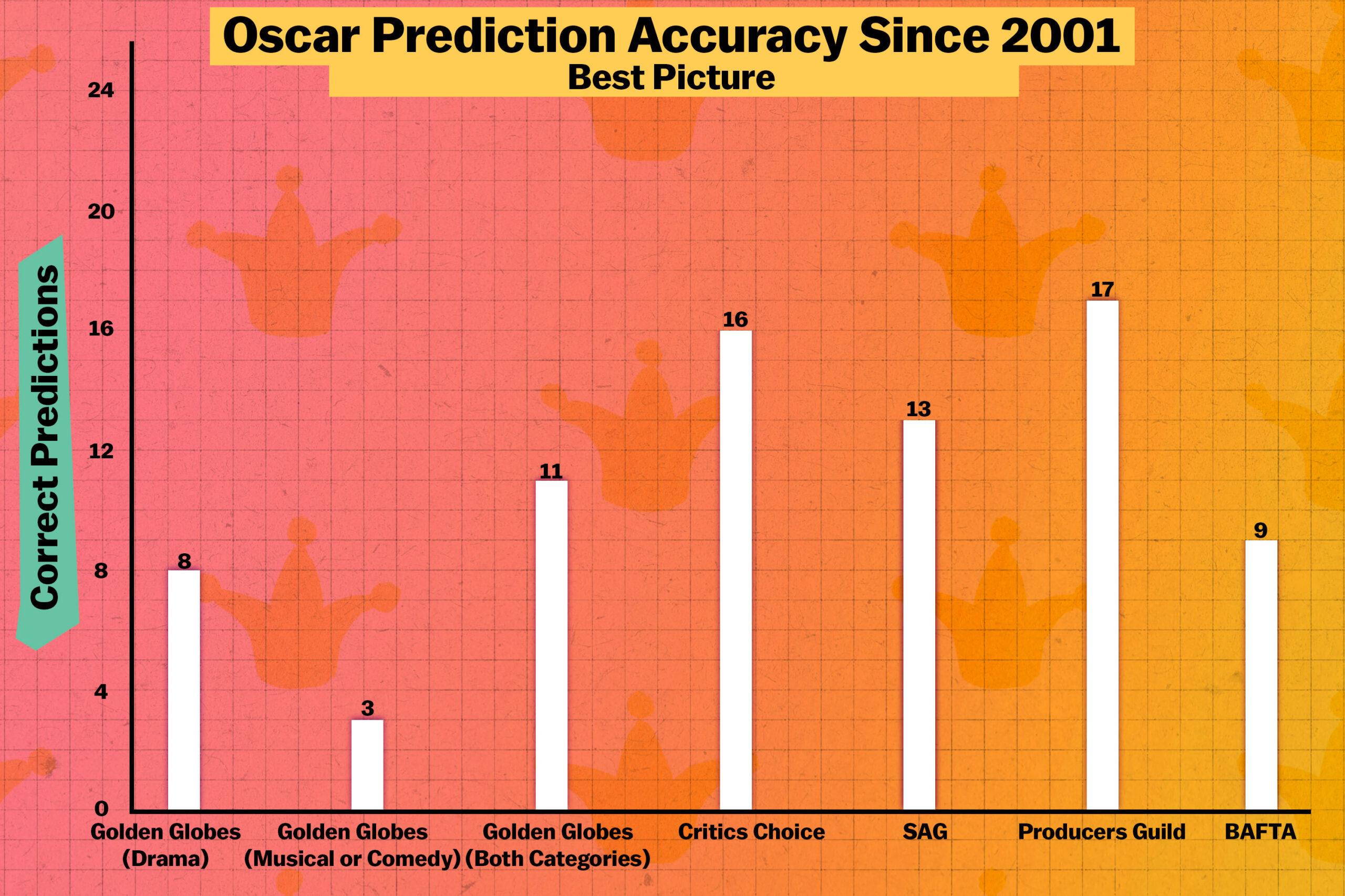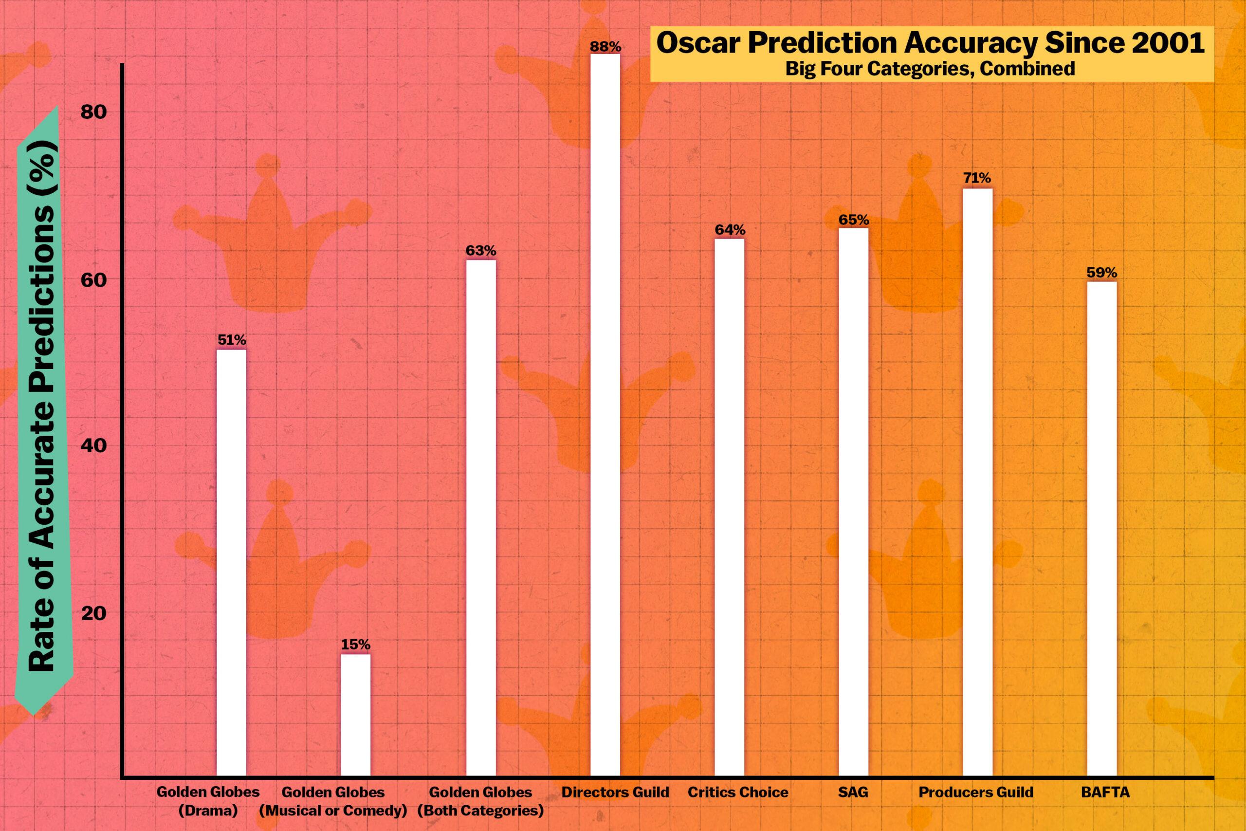 We decided to crunch the numbers to find out which precursor awards are actually useful for informing us of what’s likely going to happen at the Oscars. For the sake of brevity, we narrowed the data down to the Oscars’ top four categories: Best Picture, Best Actor, Best Actress, and Best Director. We also chose to focus on the biggest non-Oscar trophies on the awards circuit: the Golden Globes, Critics Choice Awards, BAFTAs, Actor Awards presented by SAG-AFTRA, Producers Guild of America Awards, and the Directors Guild of America Awards. (Apologies to all of the various critics circles around the country—thank you for giving so many awards to Rose Byrne for If I Had Legs I’d Kick You.) First, here are all of those awards shows’ average accuracy rates in predicting those four Oscars categories combined since 2001.