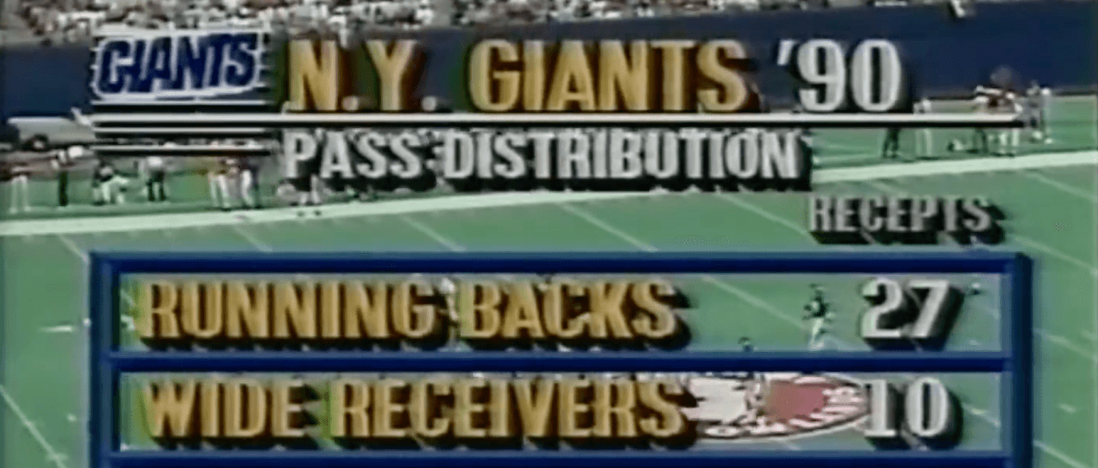 Gibbs’s offense worked with any quarterback he plugged in there, so he didn’t have to alter his play calling for Williams. The Giants took advantage of Hostetler’s athleticism by getting him outside of the pocket, but the run game served as the foundation of that offense. New York didn’t ask its quarterbacks to throw downfield too often. Their main job was to dump it off to the running backs. Here’s a graphic breaking down the team’s target distribution a month into the season when Phil Simms was at quarterback: