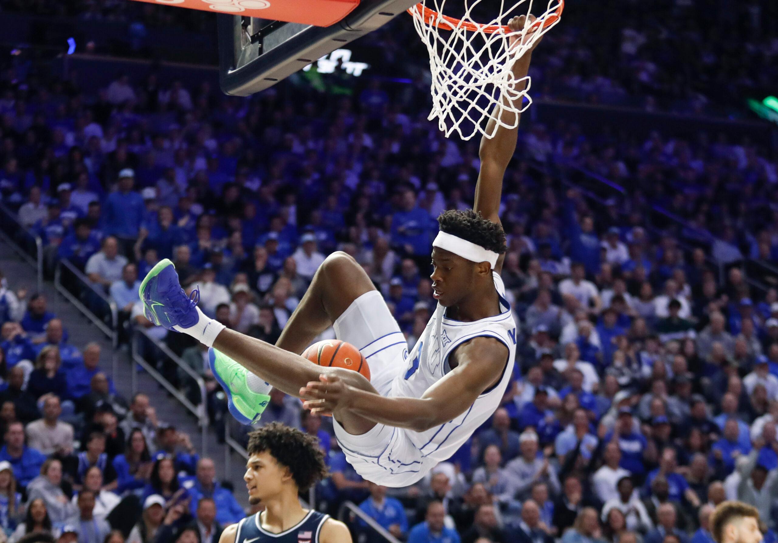 AJ Dybantsa swings from the rim after dunking against the Arizona Wildcats