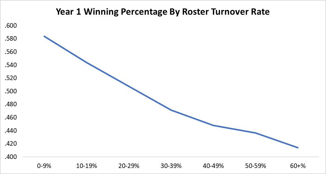 Teams with losing records in Year 1 have collectively recorded mean and median turnover rates of 32.4 percent and 31.8, respectively. Teams with winning records in Year 1 have collectively recorded mean and median turnover rates of 23.2 percent and 22.2 percent, respectively. This difference isn’t especially surprising. Losing teams have more work to do to get good, while winning teams have more incentive to stand pat. Both PR-wise and in terms of talent, losing teams face steep pressure to reshuffle their rosters. Winning teams often opt not to mess with success.