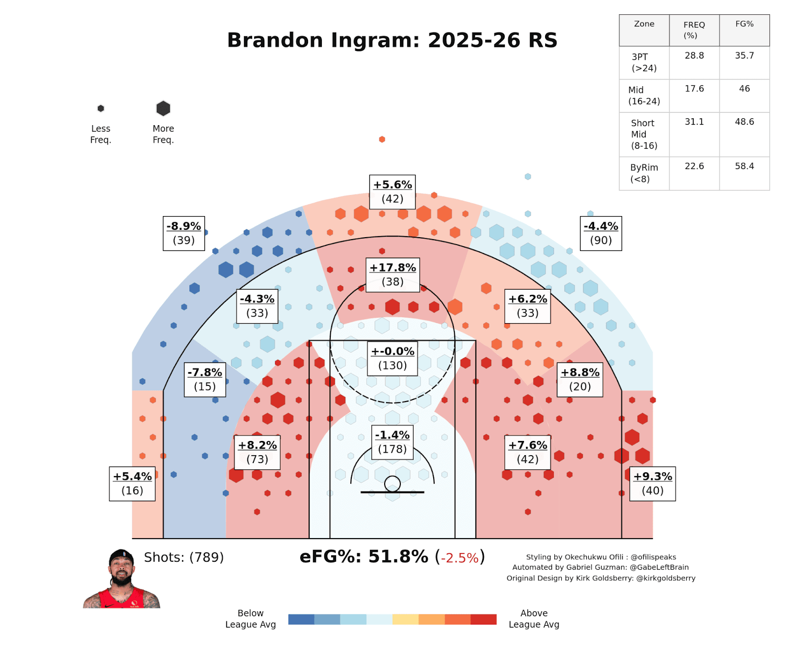 Ingram, for his part, is pretty much right in line with his career shooting splits and per-game production. The midrange is still his happy place—necessary for a Raptors team that’s desperate for difficult, one-on-one shotmaking. As has been a theme since the beginning of time, Ingram could stand to launch a few more 3s, though. The shot diet isn’t detrimental, but it does help explain why his true shooting is currently 1.4 percentage points below league average.