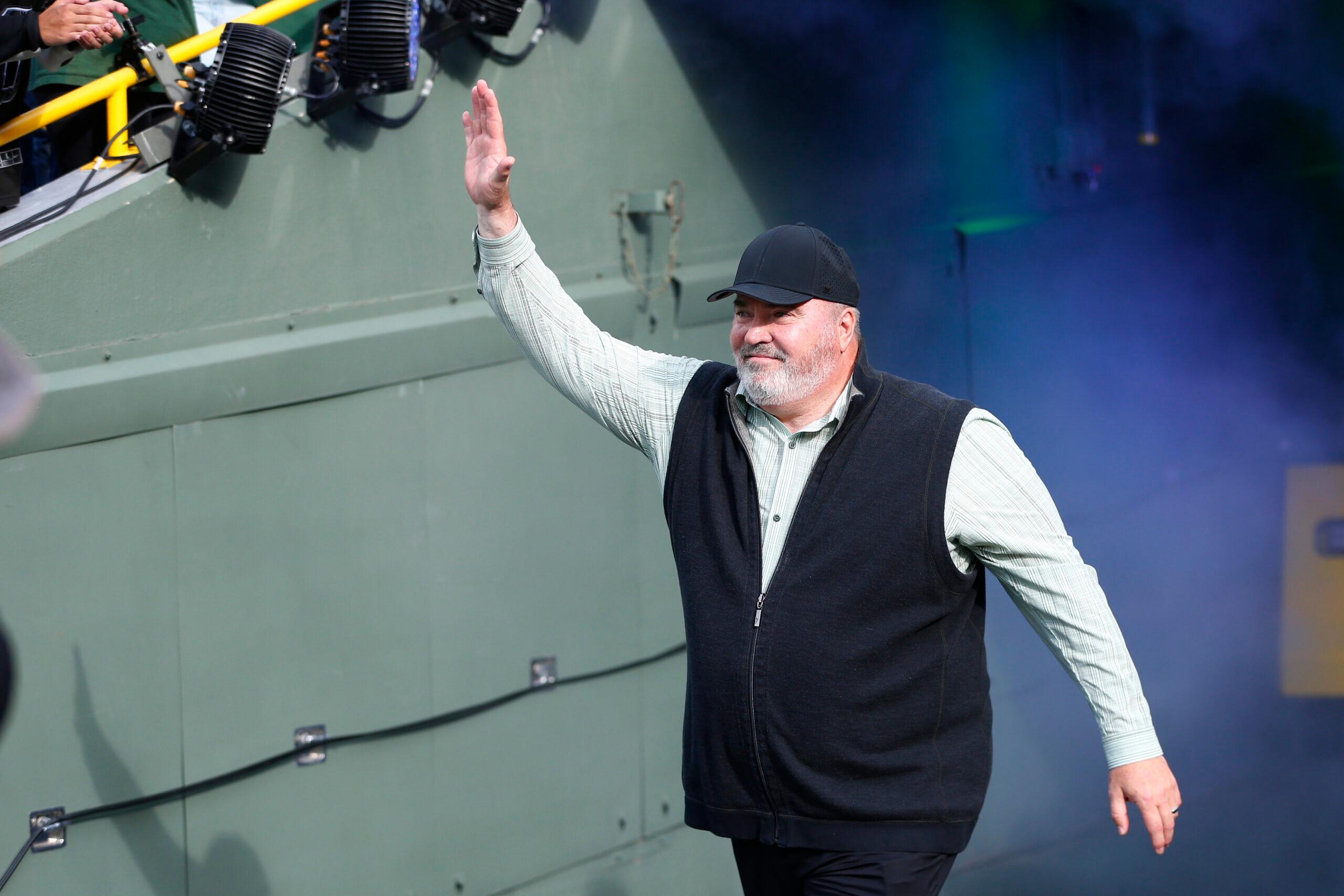 Mike McCarthy waves to the crowd during a game between the Green Bay Packers and the Detroit Lions on September 7, 2025
