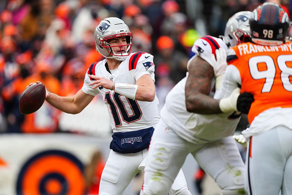 Drake Maye throws the ball during the AFC championship game