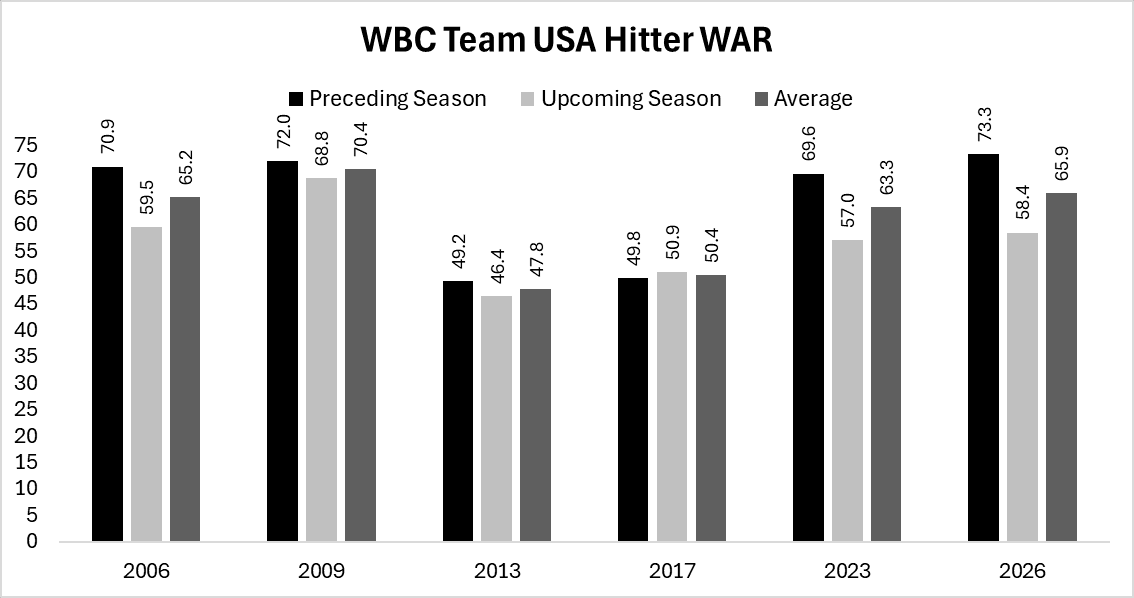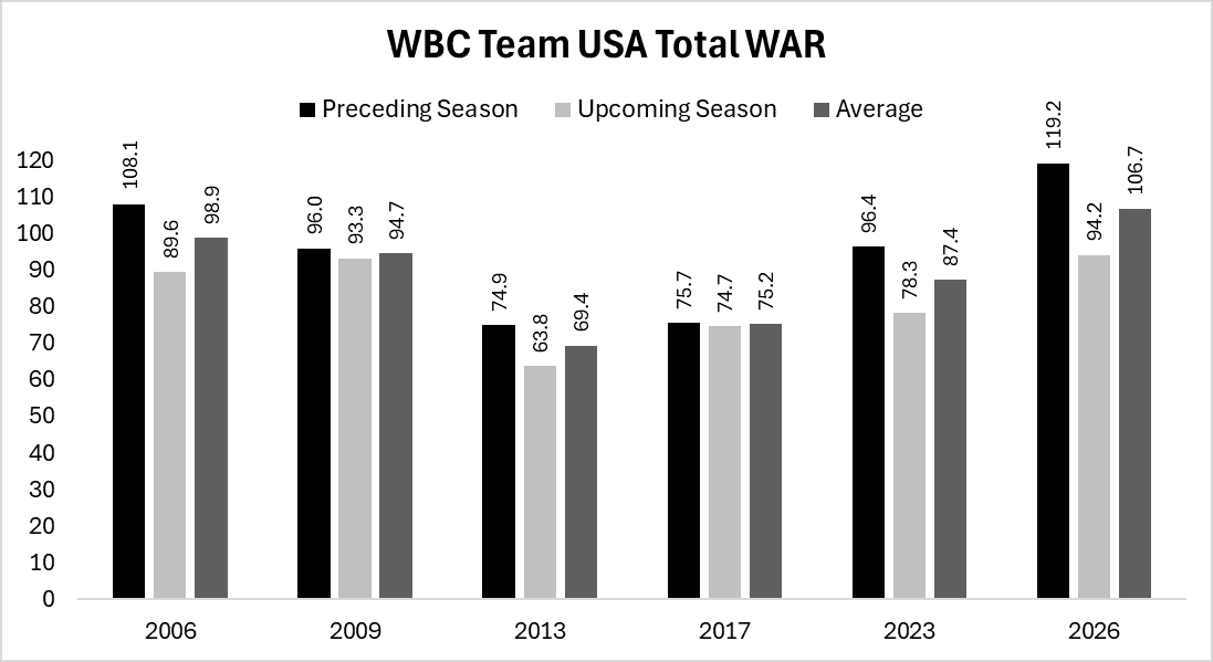 This year’s collection of position players is also the best ever by preceding-season WAR and the best in the other two categories since 2009, when DeRosa (who’ll turn 51 before this year’s WBC) was playing for Team USA. Combine the batting and pitching, and by any measure, this edition of Team USA is unquestionably better than any previous version (and, for that matter, almost certainly any WBC squad) has ever been. This is the first time that the old adage about how you can never have enough pitching might not apply to Team USA—and the first time that an American club in the WBC can truly aspire to a “Dream Team” label.
