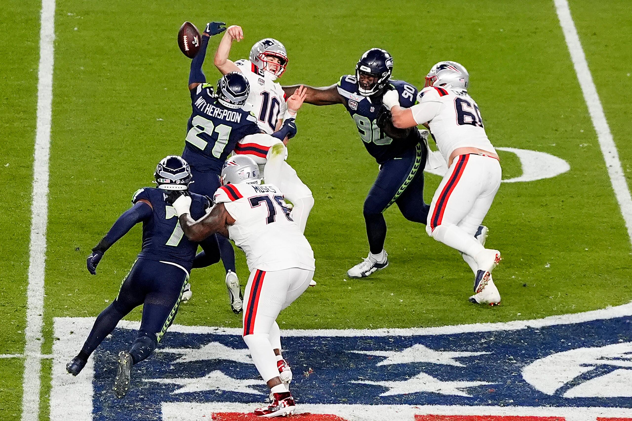 It was his worst performance by total EPA—by a considerable margin—and the third-worst game of his career by EPA per dropback. His turnovers were backbreakers, coming when the game was still relatively close in the fourth quarter. Maye had looked like he was finally settling down—he had hit back-to-back explosive throws with a touchdown to Mack Hollins to cut Seattle’s lead to 12 points at 19-7, and he was starting to drive the Patriots down the field again when he felt pressure from his blind side that forced him to step up in the pocket. But rather than taking a sack or looking for a quick, easy throw, Maye launched the ball downfield, seemingly without a clear intended target. The pass was doomed the moment it left Maye’s right hand, and safety Julian Love easily corralled the ball and returned it to New England’s 38-yard line. On New England’s next possession, Maye was winding up to throw when he was hit by two Seattle rushers, including blitzing cornerback Devon Witherspoon, whose pressure forced the ball out of Maye’s hand and into the waiting arms of linebacker Uchenna Nwosu. Maye was pancaked and lay flat on his back on the 45-yard line as Nwosu sprinted to the end zone for Seattle’s game-sealing touchdown.