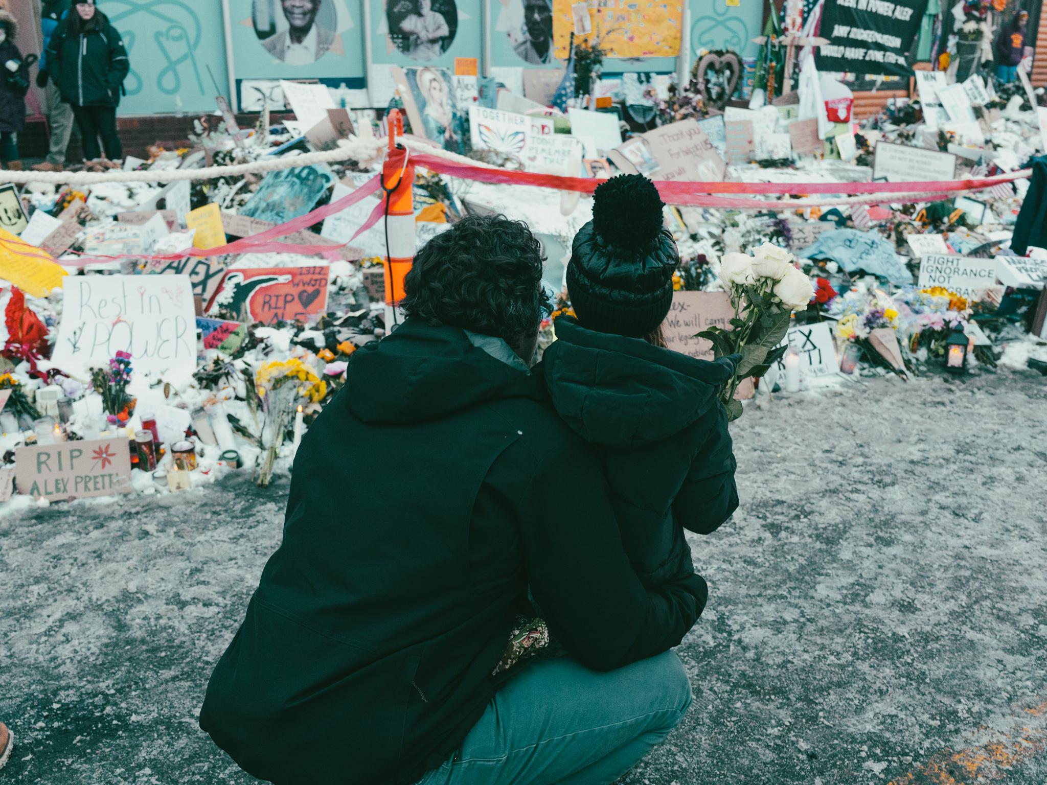 This mentality is on display everywhere I look in Minneapolis. It’s there in the young woman wearing layers of sweaters, pink tights, and thick boots who tends to the hundreds of flowers that have been laid at the site where Pretti was killed, alongside poems, paintings, and offerings of thanks. It’s there in the middle-aged man in a black hoodie who dutifully shovels the snow in front of Good’s makeshift memorial, preparing the ground for a jingle dress dance, a ritual meant to bring healing to those who suffer. It’s there in the work of everyone who transformed these sites from homicide scenes into sacred memorials, corners where people gather to weep and pray.
