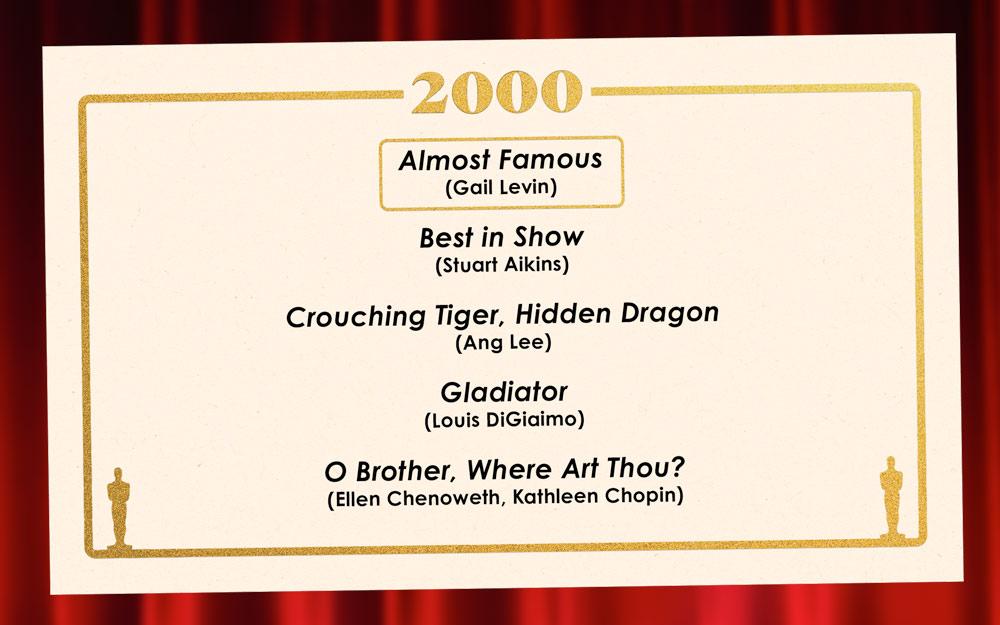 That Cameron Crowe coming-of-age film very narrowly edged out millennial finalist Crouching Tiger, Hidden Dragon, a “true experiment” of a martial arts movie spotlighting Michelle Yeoh, Chow Yun-fat, and Zhang Ziyi. While there were a couple dozen films nominated by Ringer staffers for the year 2000, the top five vote getters emerged clearly: Rounding out the group of finalists were Best in Show (how lucky that Christopher Guest directed Jane Lynch in a Frosted Flakes ad!), the life-changing O Brother, Where Art Thou?, and Gladiator (which earns its thumbs-up just for the Joaquin Phoenix casting choice). Still, what do we love most about the casting in Almost Famous? To begin with: everything. —Katie Baker