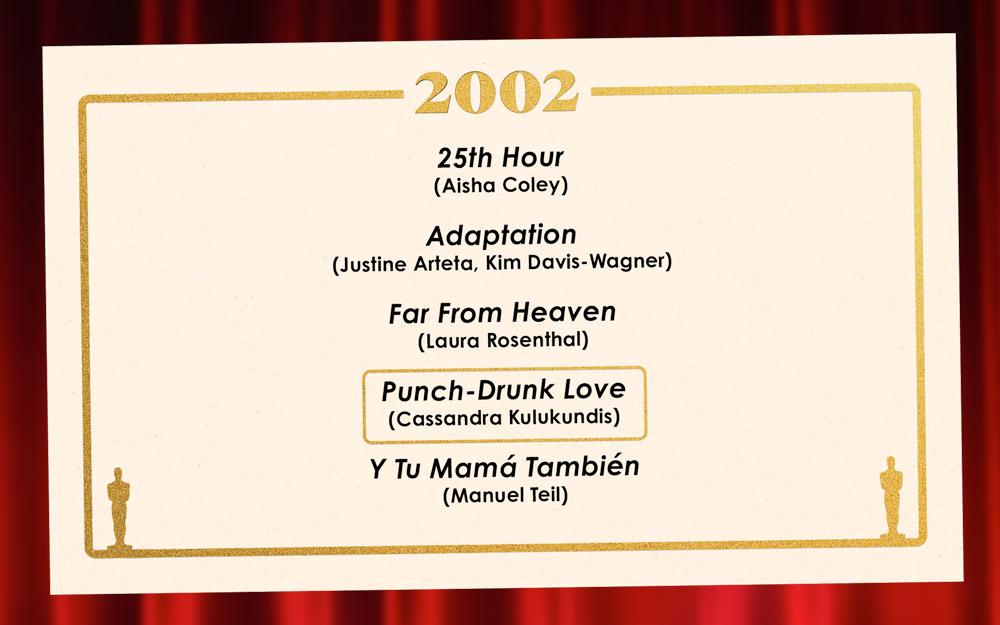 At least one film featuring Philip Seymour Hoffman would have to be nominated for its casting in 2002—and our voters picked two. 25th Hour brought the ever-engrossing actor together with Edward Norton, Barry Pepper, and Anna Paquin for an intense post-9/11 therapy session of a movie, full of long, more or less realistic and juicy conversations about guilt, desire, and NYC’s indomitable spirit. But it was the other PSH-starring film, in which the actor got to adopt a much more explosive persona, that won our prize, perhaps because it also allowed another performer to fully reveal the extent of his range. Adam Sandler may not have the sex appeal of Gael García Bernal and Diego Luna in Y Tu Mamá También, or the pedigree of a Meryl Streep or a Nic Cage, who both give life to different facets of Charlie Kaufman’s tortured personality in Adaptation. He doesn’t play self-doubt with the same subtlety and grace as Julianne Moore in Far From Heaven. But the Sandman has a love in his life, and it makes him stronger than anything you can imagine: His Barry is electrified by his passion for Lena, played by Emily Watson, who’s simply one of the greatest British actors of her generation. The unlikely yet more than credible chemistry between these two wildly different temperaments reminds us of how exciting and experimental casting can be. Punch-Drunk Love deserves its award for the way its group of performers managed to create an entirely new world, full of unexpected and thrilling possibilities for human connection. —Manuela Lazic