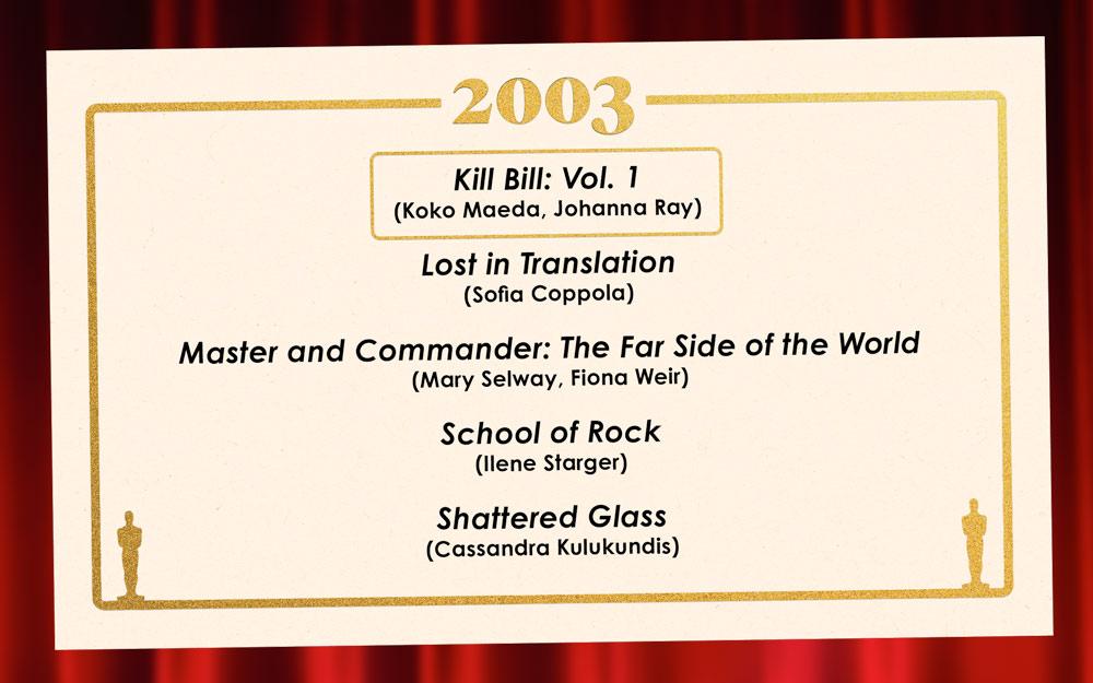 But Kill Bill’s casting triumphs don’t take anything away from our other nominees. School of Rock fought hard for the win (losing to Kill Bill by only two points) on the shoulders of its kid actors—who not only could act, play instruments, and sing like angels but were all, down to the smallest groupie, extremely fucking funny. Lost in Translation has the same air of inevitability as Kill Bill: There’s just no one besides Scarlett Johansson and Bill Murray who could have been Charlotte and Bob. Sofia Coppola obviously knew that, too, and she spent years trying to track down the elusive Bill Murray through nepo-baby contacts like Al Pacino, Wes Anderson, Bob Costas (?), and Mitch Glazer. Shattered Glass, on the other hand, lucked into its best bit of casting, landing Peter Sarsgaard as the assiduous New Republic editor Charles Lane only after Greg Kinnear dropped out (again—can you imagine??).