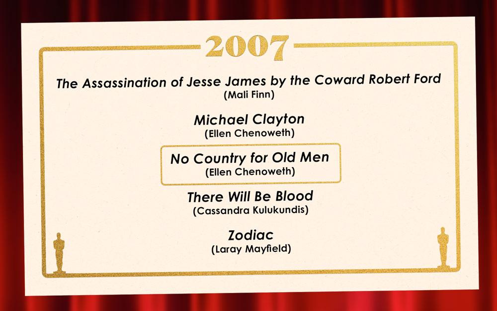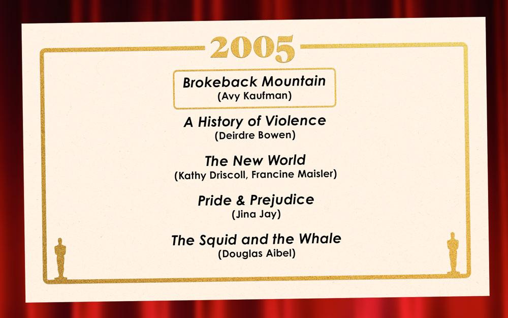 If more really is more, The New World would be a worthy winner: The casting team for Terrence Malick’s historical epic hired dozens of Indigenous performers—including an astonishing Q'orianka Kilcher, the 15-year-old actor who more than holds her own in scenes opposite Colin Farrell and Christian Bale. But casting is often about seeing the potential for a powerhouse turn, and in that regard, no one climbed higher than Brokeback Mountain casting director Avy Kaufman. In Heath Ledger and Jake Gyllenhaal, she found two young stars on the cusp of greatness—both former child actors, just like their terrific costars Michelle Williams and Anne Hathaway—and helped convince them to take roles that might risk their reputations in a homophobic Hollywood. The performances (especially Ledger’s anguished turn as the closeted Ennis) speak for themselves and for Kaufman’s savvy instincts. Also, consider this retrospective award revenge for Crash’s shocking Best Picture victory over Brokeback—still one of the most upsetting upsets in Oscar history. —A.A. Dowd