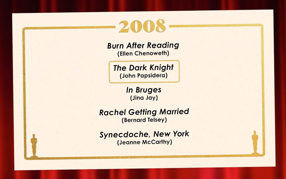 Our other nominees in 2008 are no slouches, either: Burn After Reading is arguably the funniest Brad Pitt has ever been; Synecdoche, New York belongs in the Philip Seymour Hoffman pantheon; Rachel Getting Married stands as proof that few filmmakers assemble better casts than the late Jonathan Demme. The last slot was filled by Martin McDonagh's directorial debut, In Bruges, which just edged out Happy-Go-Lucky and Slumdog Millionaire in our voting. Call it a banner year in which everything from a superhero crime epic to a Coen brothers screwball comedy to a family psychodrama delivered casts operating at the top of their game. —Miles Surrey