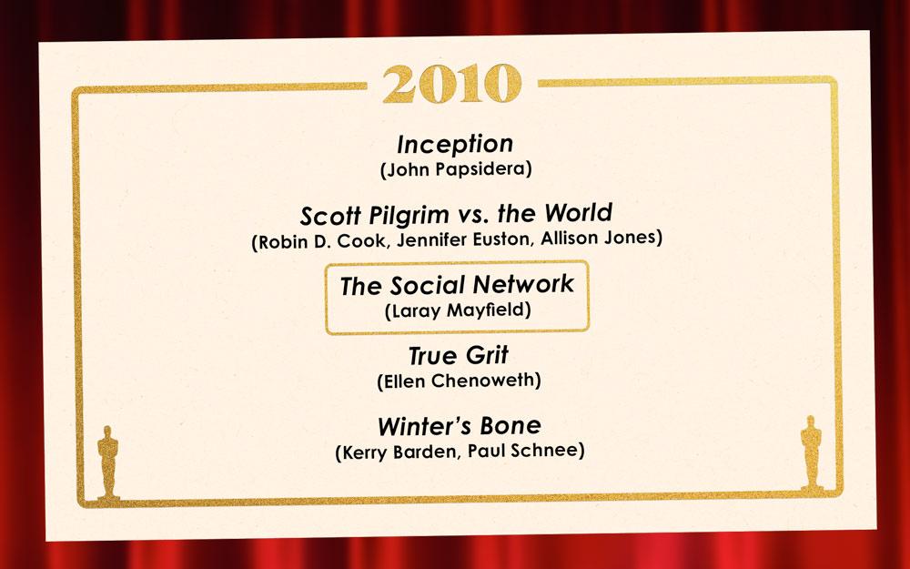 Nine of 13 voters selected True Grit as a nominee, perhaps out of respect for the discovery of 14-year-old Hailee Steinfeld, who played the quick-witted Mattie Ross and was nominated for Best Supporting Actress. Winter’s Bone is another strong contender in the once-in-a-generation discovery category, considering it launched Jennifer Lawrence’s career—it was her breakthrough role and earned her a nomination for Best Actress, making her, at the time, the second-youngest nominee in the category ever. As a whole, the 2010s nominees represent star power that doesn’t exist anymore and breakthroughs that would define the decade. If this poll is any indication, had the casting Oscar existed in 2010, The Social Network could have won in a landslide. But in reality, it would have lost to The King’s Speech. —Carrie Wittmer
