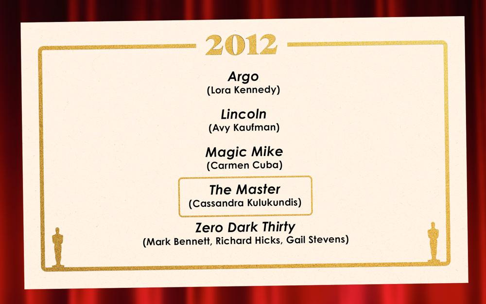 Strong year for the category, even stronger winner. What I love about The Master’s cast is that each of its super-talented actors—Philip Seymour Hoffman, Joaquin Phoenix, Amy Adams, Laura Dern—embodies such a unique flavor of weirdness that they all seem to come from different planets. But instead of trying to get everyone in sync, The Master leans into the feeling of incompatibility. Every encounter becomes a physics experiment in hugely charismatic talents warping each other's fields of gravity. Argo and Lincoln are films in which great casts perform in a movie; The Master is a film in which a great cast seems to be discovering a movie as it goes (and risking their lives while doing it). Magic Mike has its own cool alchemy and could easily have won in a different year, but The Master ran away with this one, and rightfully so. —Phillips