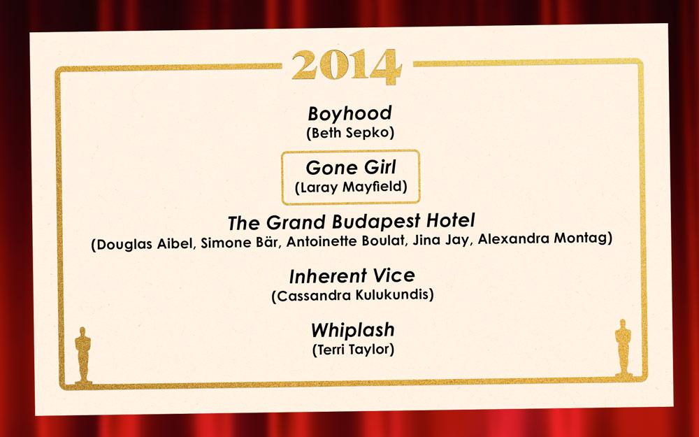As usual, Wes Anderson and Paul Thomas Anderson assembled impressive casts in The Grand Budapest Hotel and Inherent Vice, respectively. The excellence of Whiplash is epitomized by J.K. Simmons’s terrifying, Oscar-winning performance as jazz instructor Terence Fletcher, who will give anyone who suffered through a tyrannical high school coach unpleasant flashbacks. But with respect to the other nominees, Gone Girl ran away with this thing. Earning 17 more points than second-placed Boyhood—which deserves plenty of credit for Richard Linklater’s decade-plus dedication to filming a child growing up before our eyes—Gone Girl has a lot going for it. It’s one of the finest performances in Ben Affleck’s career; he makes you believe that Nick Dunne is equally capable of murder and spectacular cluelessness. (As David Fincher said of Affleck in the Gone Girl DVD commentary: “He’s so duplicitous.”) Meanwhile, Rosamund Pike is so magnetic as Amy Dunne that she’ll leave you ready to risk it all. (Or is that just me?)