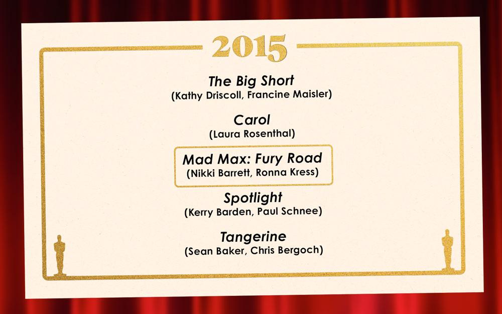 Making up the rest of the nominations are two splashy, starry ensembles about the important stuff (The Big Short and Spotlight), a gorgeous Sirkian two-hander (Carol), and an indie darling that represented Sean Baker’s explosion into the mainstream (Tangerine). It’s the latter that stands out the most among this crop. Sure, Cate Blanchett and Rooney Mara yearned their way into our hearts in Carol, and Mark Ruffalo perfected his righteous hangdog persona in Spotlight, but Tangerine’s cast electrifies. Even in 2015, casting not one but two trans women as leads felt unheard of. As the delightful Kitana Kiki Rodriguez and Mya Taylor race around L.A. and run into Baker’s now-patented eclectic bunch of misfits (including Anora standout and frequent collaborator Karren Karagulian), you can feel the next decade of indie filmmaking unfold before you. —Brandon Streussnig