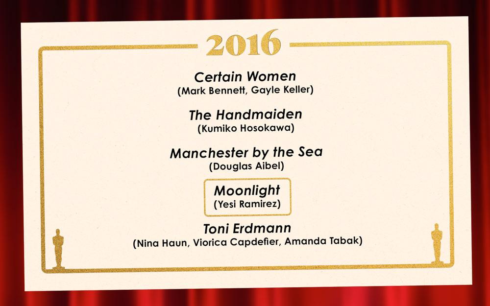 I’ll address the jazz-singing elephant in the room: La La Land did not make the cut. It didn’t even come close! Damien Chazelle’s musical notched just one measly vote from our panel. As a result, our Best Casting winner was announced without a hitch—Moonlight is one of the most dominant winners from this entire exercise. And for good reason: Barry Jenkins’s seminal coming-of-age drama had the tough task of finding three actors to portray its lead at three distinct ages. Expecting the audience to buy that a character is emotionally experiencing the fallout from an event played out by an entirely different actor is a tough ask! Moonlight not only accomplishes this but also manages to fill out the cast with performances that linger far beyond their screen time, limited by the film’s construction. There’s Mahershala Ali, of course, who skyrocketed after winning an Oscar for his unforgettable role as complicated father figure Juan, but there’s also Naomie Harris, Janelle Monáe, André Holland—all adding rich details to Jenkins’s stunning portrait of Black masculinity. As for the rest of the nominees, we gave the films of Park Chan-wook (The Handmaiden) and Kelly Reichardt (Certain Women) the Oscar recognition they’re still chasing to this day, acknowledged the German two-hander that gave us Sandra Hüller’s best performance (Toni Erdmann), and nominated the impossibly sad Casey Affleck vehicle that somehow managed to live on in memes (Manchester by the Sea). But nearly 10 years later, Moonlight still shines brighter than the rest. —Ress