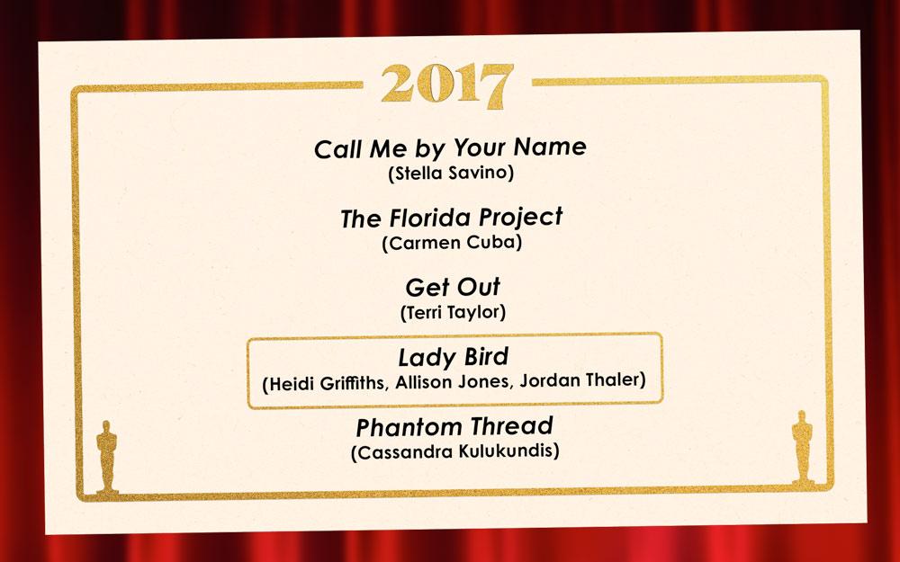 Such is the power of Lady Bird’s multitudinous cast, which won this year pretty handily among a strong consensus five: Call Me by Your Name, which contains perhaps the breakout performance of the last 10 years in young Timmy Tim; The Florida Project, which somehow successfully combined nonactors, children, and Willem Dafoe; Get Out, which (among many other things) understood that Allison Williams plays a great little freak; and Phantom Thread, which knew the power of Lesley Manville and a teacup and also found Vicky Krieps, perhaps the only actor who could go toe-to-toe with Daniel Day-Lewis and win. —Wilson