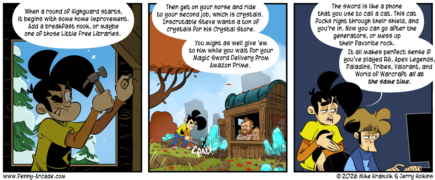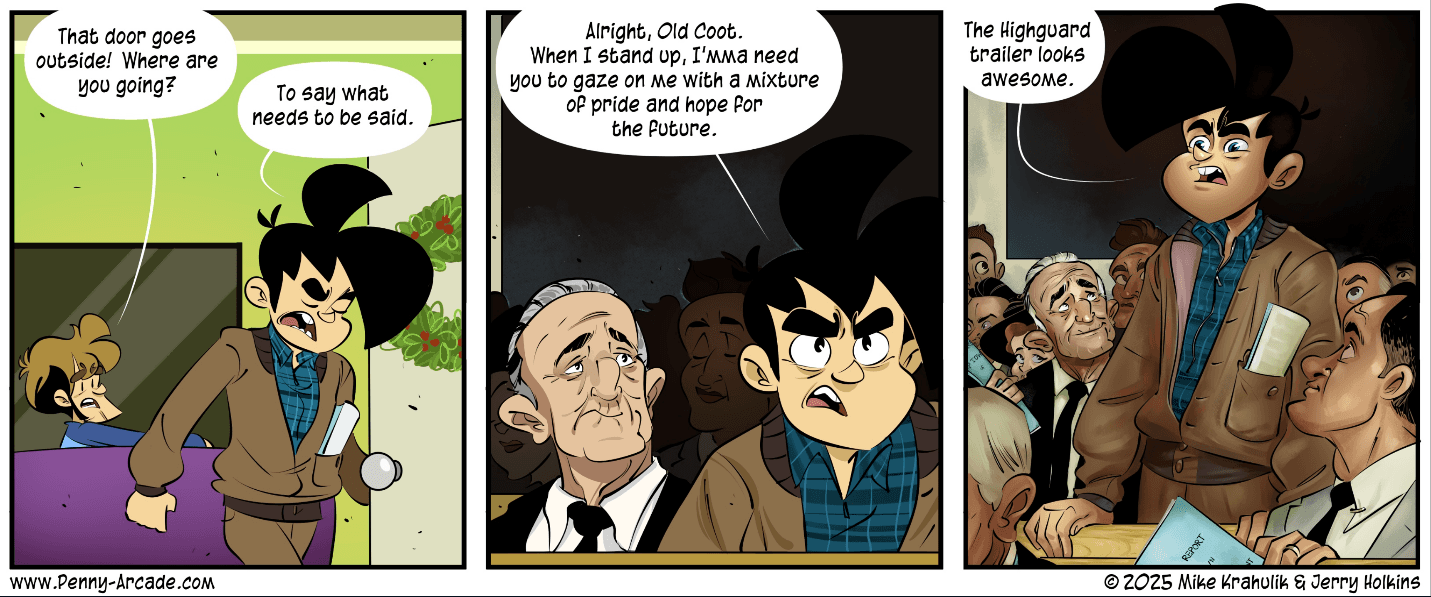 Keighley thought wrong. “Pretty crazy!” he crowed after the footage was finished, which more or less summed up spectators’ response to his programming decision. Much of the internet was unimpressed or incensed by its first glimpse of Highguard, and the dislike counts on the YouTube trailer climbed like Maverick’s F-14 outrunning missiles in the sequel to Top Gun. The backlash was such that it took guts to suggest that the game might be good, as the webcomic Penny Arcade documented.