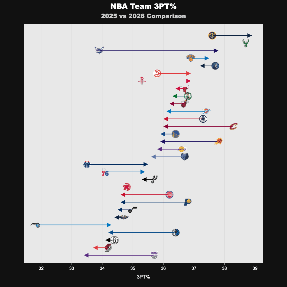 It’s not easy to capably integrate a style of play that falls flat sans constant movement, speed, and intention. But the Hornets have done it in a short period of time by embracing a selfless mentality, trusting the extra pass, and, critically, drilling a high percentage of the quality looks they create for one another. It isn’t just LaMelo, Knueppel, and Miller. Josh Green, Grant Williams, and Coby White are all genuine threats who can’t be left alone, and no team’s 3-point percentage has rocketed up the charts like Charlotte’s this year: