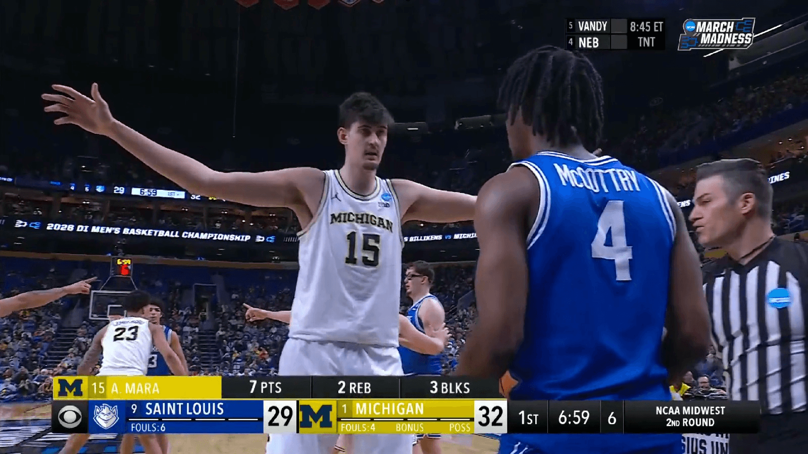 Michigan has been the country’s best defensive team all season, and its 95-72 win over Saint Louis on Saturday was a 40-minute exhibition of what makes the Wolverines so damn hard to score on. I mean, just look at this shot of center Aday Mara defending an inbounds play.