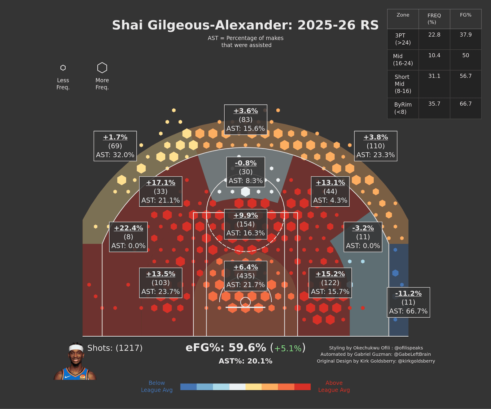 This man could average 25 points per game wearing a bathrobe and slippers. In a Thunder jersey and SHAI 001s, he’s up at 31.6, converting 60.1 percent of his 2-point shots. Just look at his shot chart. Don’t stare too long, though. It might burn a hole in your retinas.