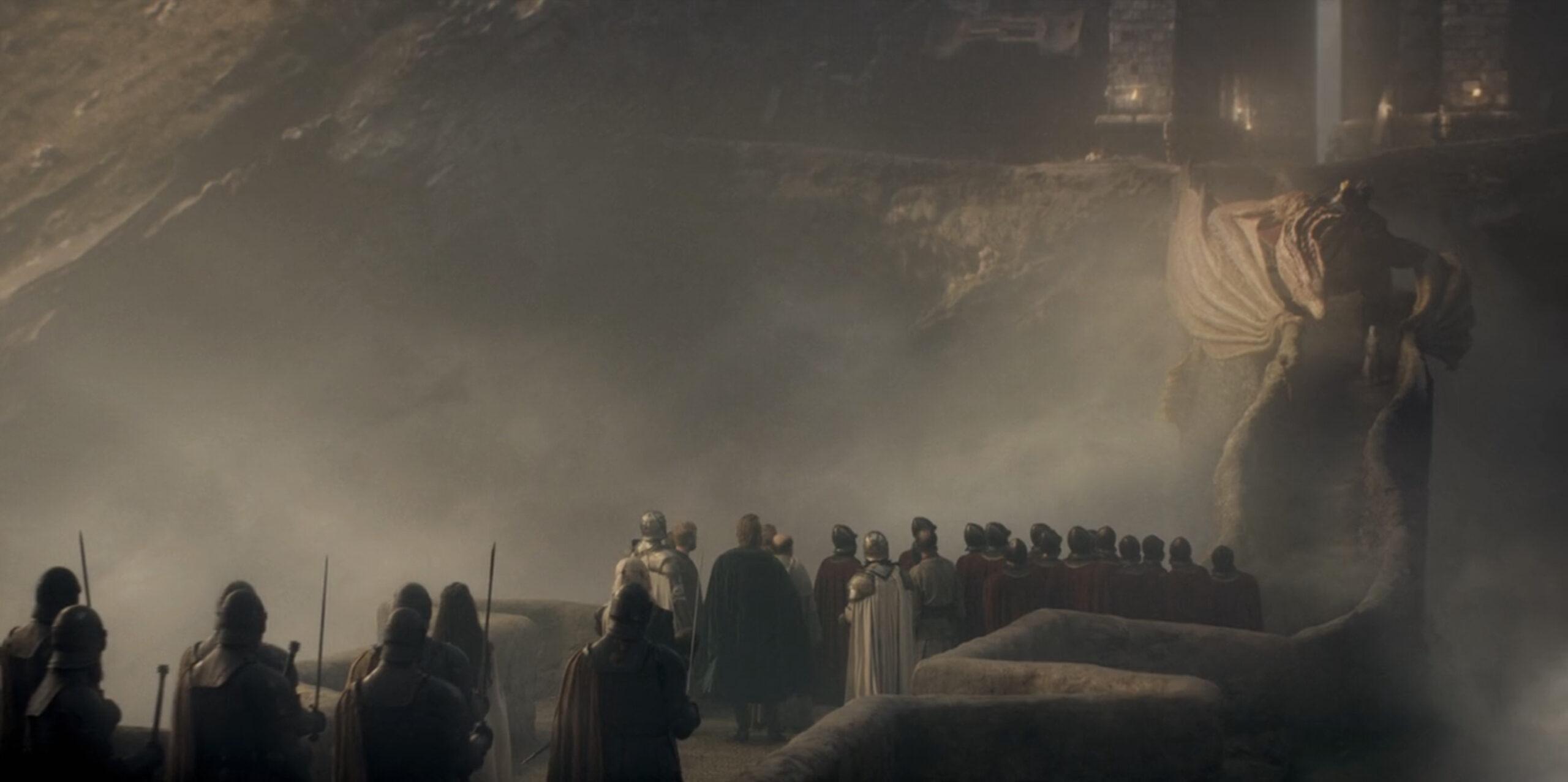 How does she, now grown with an even bigger mount, get down? The only thing we know is that it is accomplished very, very quickly, because she’s strolling down the parapet a few frames later, perilous scramble down the side of a living creature on a precariously narrow bridge be damned—and that’s not to mention the fact that Martin wrote in Fire & Blood, the series’ source text, that riders typically buckled themselves in with “four short chains between belt and saddle.” Fussing with buckles like some trainee goth: decidedly not metal.