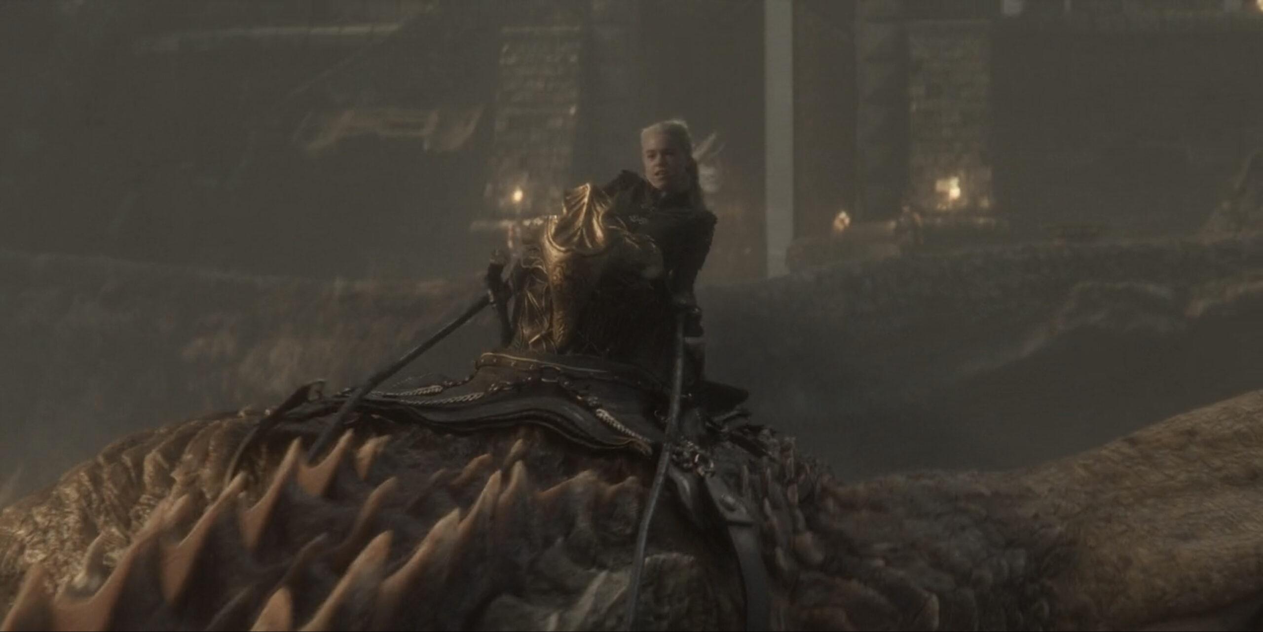 For the most part, we see dragonriders only when they’re already in the saddle. There wasn’t a single dismount featured in Season 1; instead, we had some rapid cuts and a whole lot of yada yada about the logistics. Here, for example, is Rhaenyra in Syrax’s saddle as she arrives for a showdown with Daemon at Dragonstone: