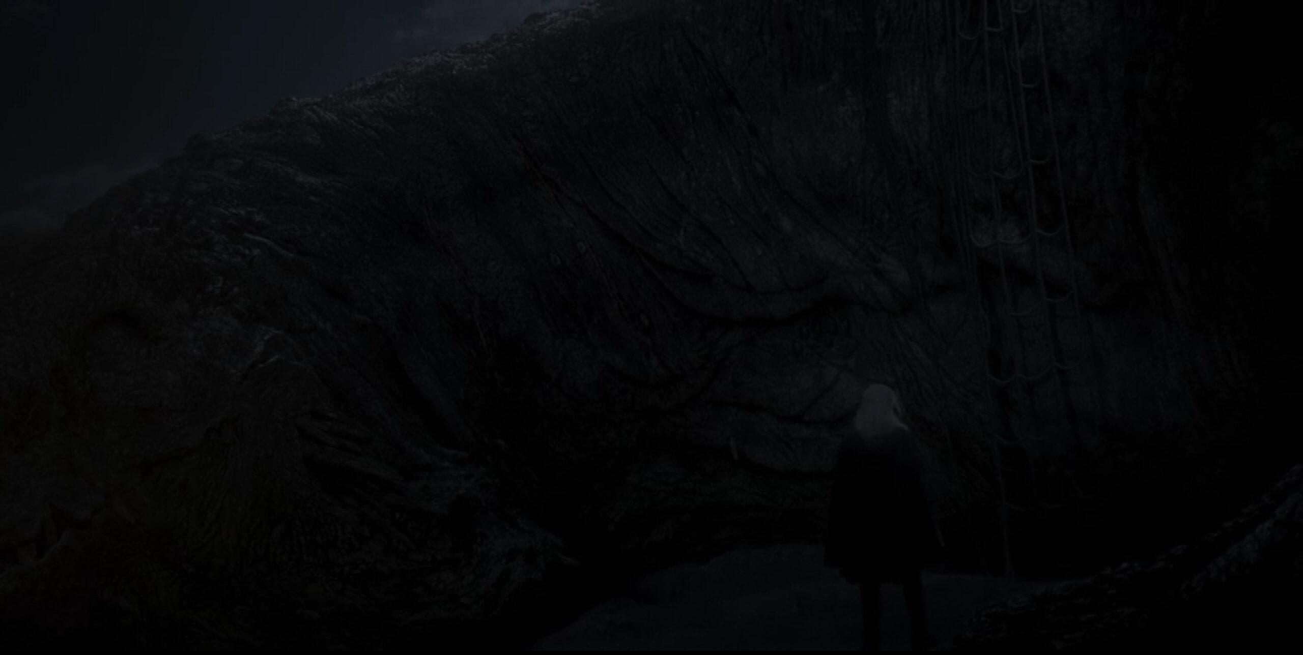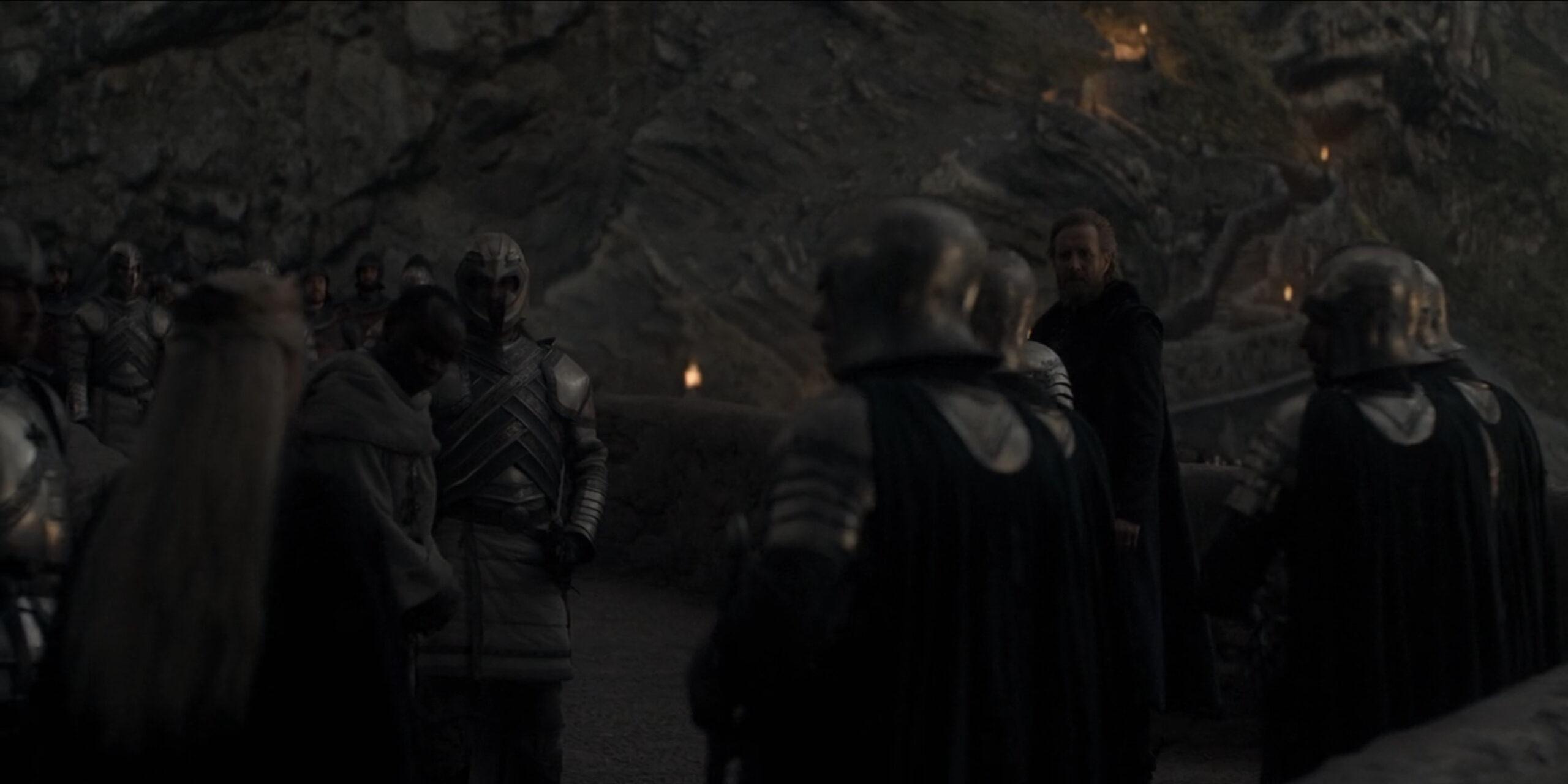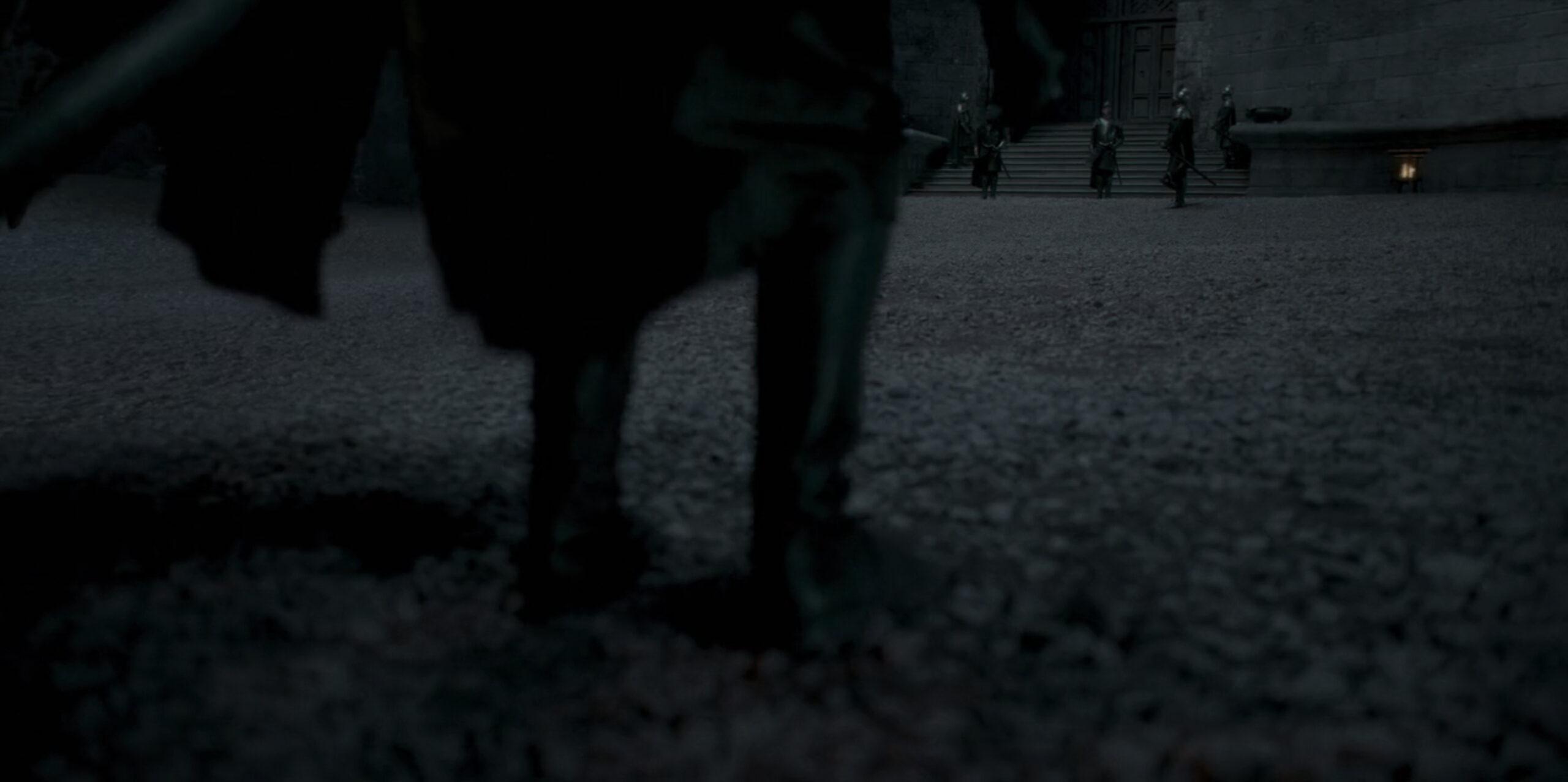 There are just two instances in which we get a look at what climbing into the saddle entails. Luke’s final ascent on his dragon began when the doomed tween hopped sideways onto Arrax, whose petite stature took about as much finesse to tackle as a resting camel’s might. It was a different story when Aemond claimed Vhagar: He discovered that the biggest, baddest dragon in the land had a handy little climbing net draped down her side (which does not appear particularly fireproof, but I digress). I promise that there is a net in this tableau of shadows—the darkness’s impenetrability is absolutely because of your lousy TV settings and not deliberative creative choices that we simply do not need to repeat in the coming season.
