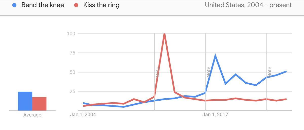 Kissing the ring is out. Bending the knee is in. (By the way, if you’re wondering why “kiss the ring” popped in 2012, you can credit DJ Khaled. That 2017 spike for “bend the knee” was all Jon and Dany.)