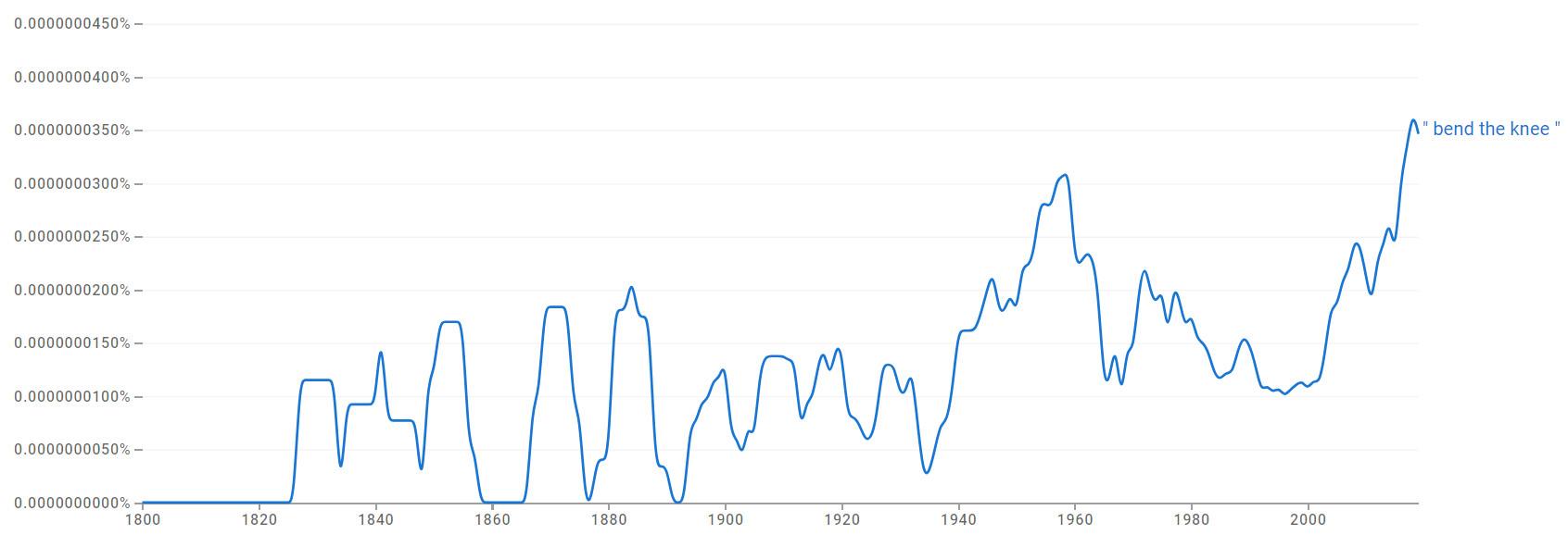 Thrones has long been a staple of political discourse. (If you think Vance’s stances have been divisive, check out what one of the Democratic VP hopefuls just said.) But it’s not just the political class that’s newly enamored of this saying. The culture’s increasing knee-diness is evident in this graph from the Google Books Ngram Viewer, which displays data through 2019: