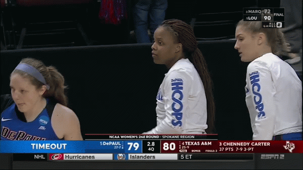 The player on DePaul’s bench who dejectedly mouths the word “Fuck” to herself after Chennedy’s shot goes in at about the 0:17 mark of the video.