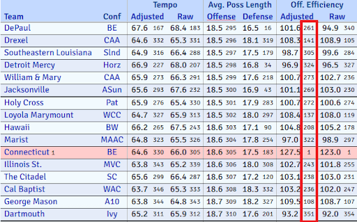Those are the kinds of possessions basketball coaches dream of, and UConn had a dozen (or two dozen) of them per game. The Huskies would push the ball in transition off of a miss or turnover, but they took their time when they got into their half-court offense, finishing the season ranked 330th in adjusted tempo and 305th in average possession length, per KenPom. That’s typically a bad sign for an offense. Teams that play that slowly on the offensive end don’t typically do it on purpose; they just struggle to get off shots and work against the shot clock. Look at the teams that run their offense at a similar pace. They all rank outside the top 100 in adjusted offensive efficiency, and then there’s UConn’s “1” sticking out.