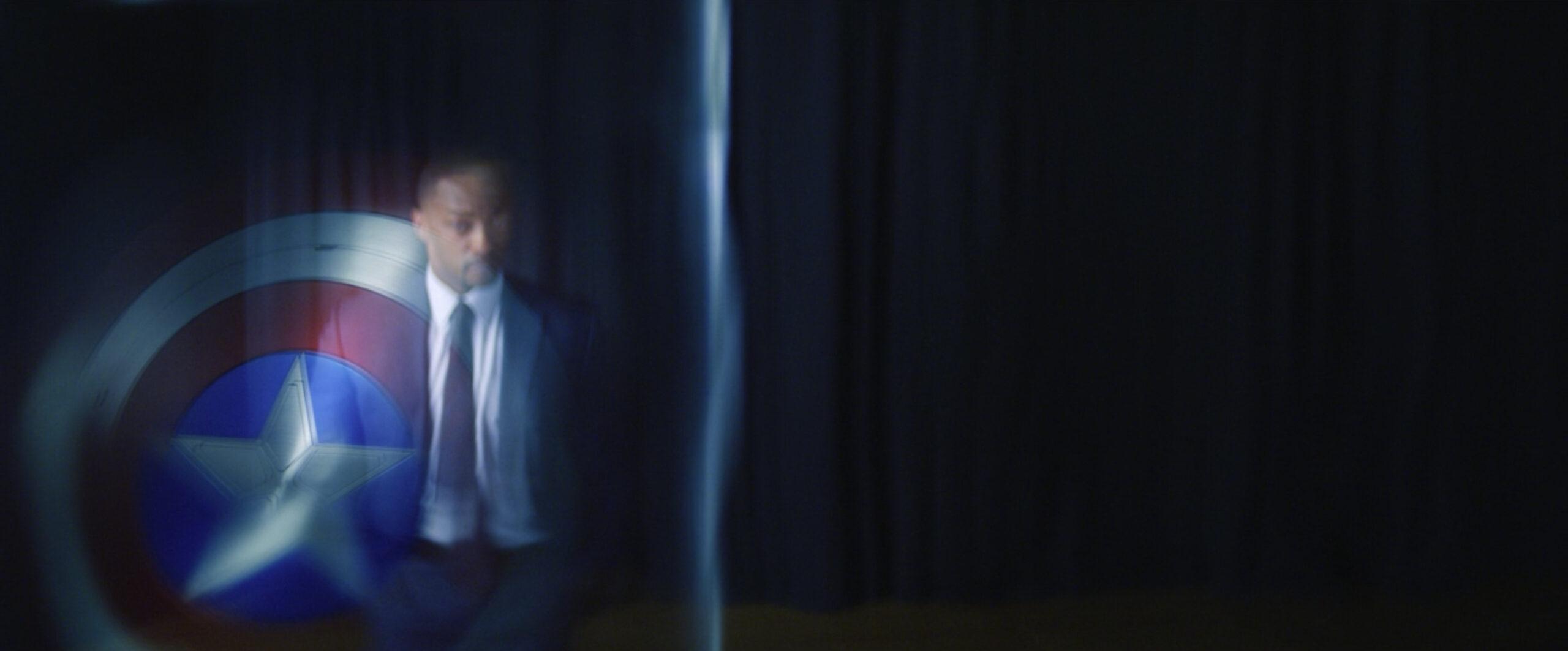 Mid-speech, Sam picks up Cap’s shield from where it was resting against the podium. “This thing … I don’t know if there’s ever been a greater symbol,” Sam continues. “But it’s more about the man that propped it up—and he’s gone.”