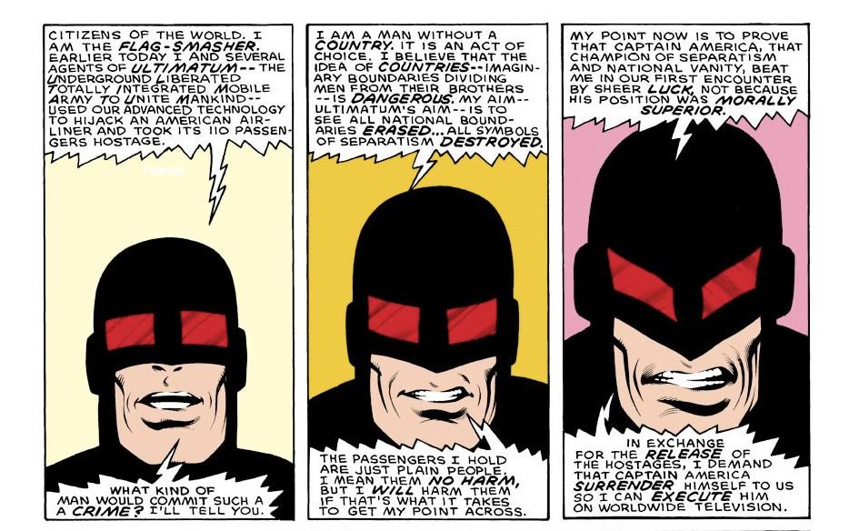 The Flag-Smashers have roots in the comic books, but rather than being an entire group of anarchists, the Flag-Smasher is originally just one man: Karl Morgenthau. First appearing in Captain America no. 312, in 1985, Flag-Smasher has a long history opposite Steve Rogers. The son of a Swiss banker turned diplomat, Morgenthau becomes radicalized after his father is killed during a peaceful demonstration that goes awry. Morgenthau then commits his life to destroying the ideas of nationalism and countries in favor of a more unified world. (In a truly on-the-nose introduction to match his silly name, Flag-Smasher makes his debut by riding in on a fancy aircraft and, uh, smashing flags at the United Nations Plaza in New York before crying out his name into the night.) He is, of course, meant to be the ideological antithesis of Captain America, who fights crime in an American flag costume. Soon after his first encounter with Cap, Morgenthau becomes the leader of a terrorist organization known as U.L.T.I.M.A.T.U.M., which shares his vision for eliminating symbols of nationalism and separatism with the purported intention of creating world peace. (Marvel absolutely loves ridiculously wacky acronyms, and this one has to be an all-timer: Underground Liberated Totally Integrated Mobile Army to Unite Mankind. Comics in the ’80s were really something else.)
