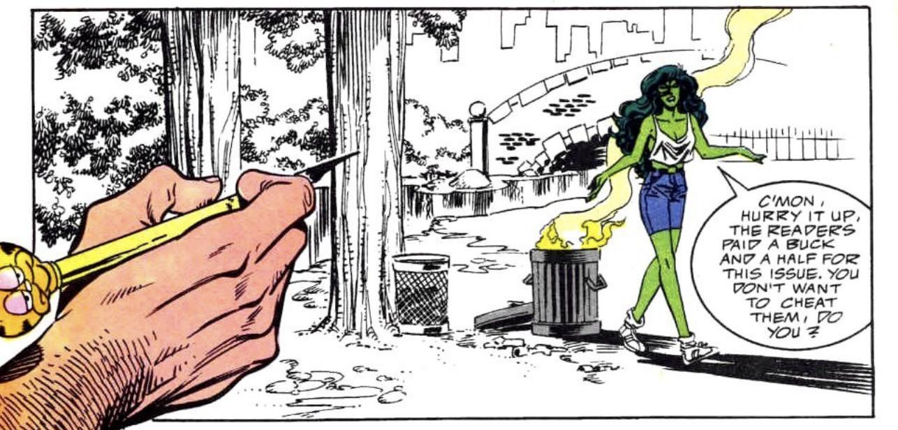 Gao has often cited John Byrne’s Sensational She-Hulk comics run as a source of inspiration for the show and its fourth-wall-breaking moments, and that influence shines through clearer than ever in the season finale. “It felt natural … not only that she was in a show, but that she would have opinions about the show, especially since she just was completely betrayed by the makers of this show,” Gao told Marvel.com. “It just felt right that she would go and complain to the ultimate lord of Marvel, which is K.E.V.I.N.” In Byrne’s comics, She-Hulk would often leap across panels to save herself the trouble of commuting in Los Angeles, and sometimes would even rip out the pages she was drawn onto if the situation called for it: