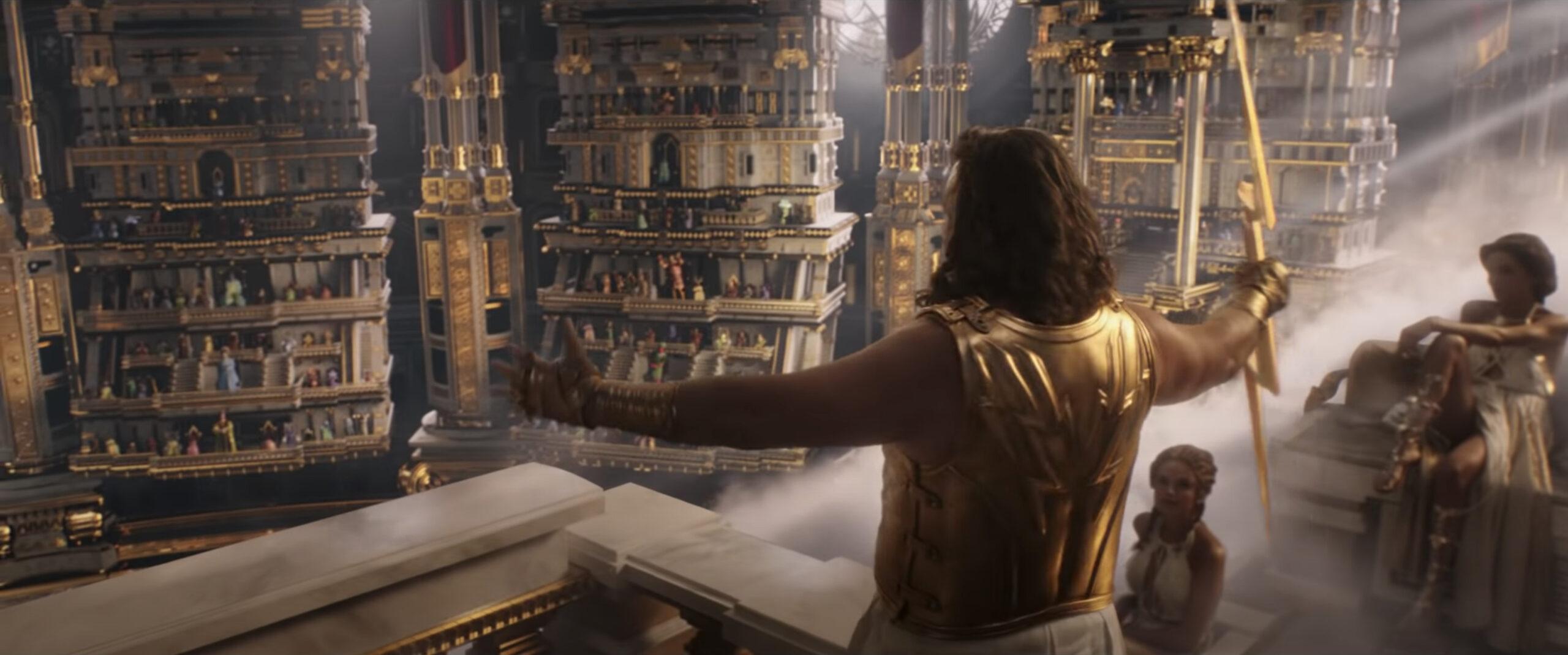 While the trailer withholds any appearances by the film’s main villain, Christian Bale’s Gorr the God Butcher, it does provide a first look at the fabled Olympus. In light of the dearth of gods in the MCU, Norse mythology is being replaced in Love and Thunder with that of the Greeks, as Thor crosses paths with another god of thunder: Zeus. Though his role in the movie is reportedly only cameo-sized, Russell Crowe (or at least the back of his head) has arrived:
