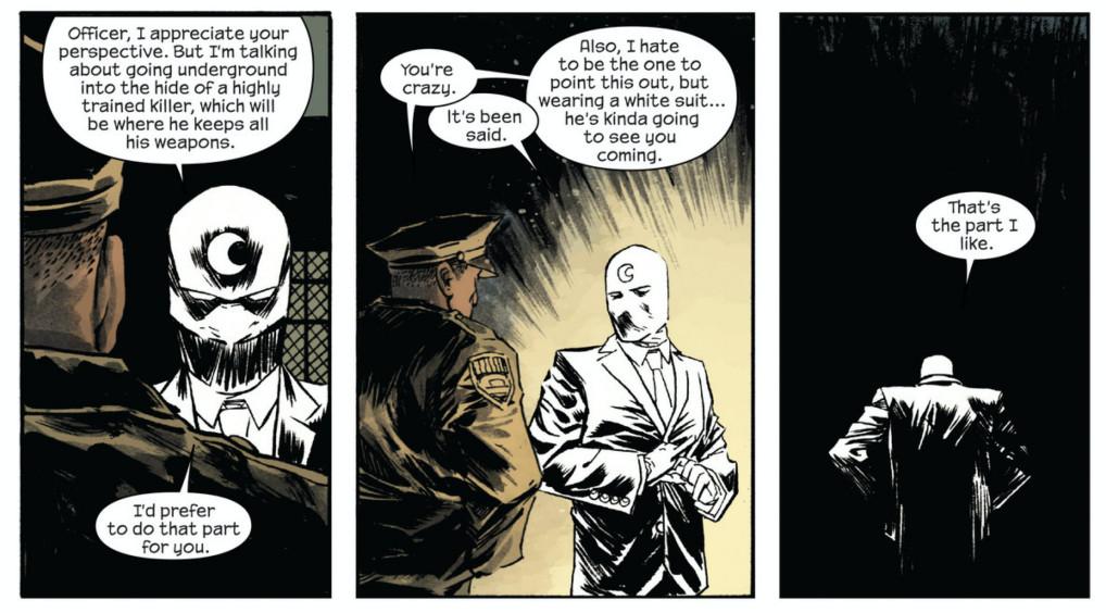 Instead of landing on his feet wearing the ceremonial armor from Khonshu’s temple, Steven transforms into “psycho Colonel Sanders,” as an exasperated Marc characterizes his bodymate’s badass form. While Steven’s new look has yet to receive a name in Moon Knight, the suit is rooted in one of his identities in the comics: Mr. Knight.
