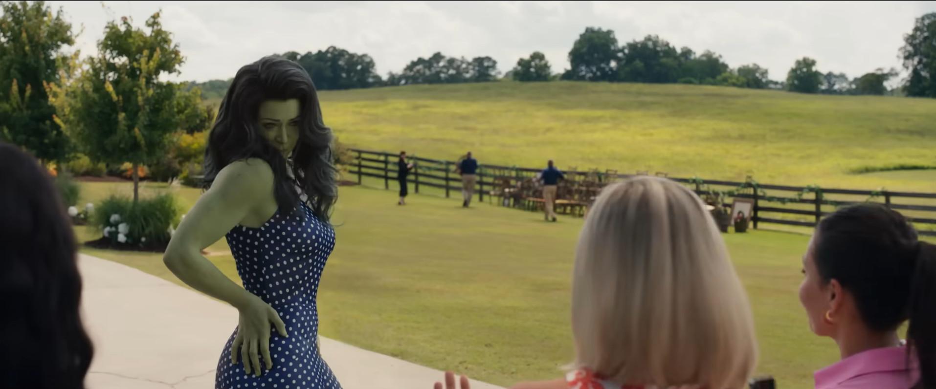 Excluding that one man-toting moment, however, the She-Hulk trailer was not warmly received. The low-budget-looking CGI was rife for jokes—for example, one could say that the green hue of Tatiana Maslany’s She-Hulk looked more like the Jolly Green Giant tore through an Ann Taylor Loft Memorial Day sale than like Jennifer Walters got juiced up with beefy, beefy gamma radiation. And all of those jokes were mostly fair and accurate—but the problem with this early trailer wasn’t a matter of which shade of green Marvel went with. The problem was a matter of size. Stay with me here …
