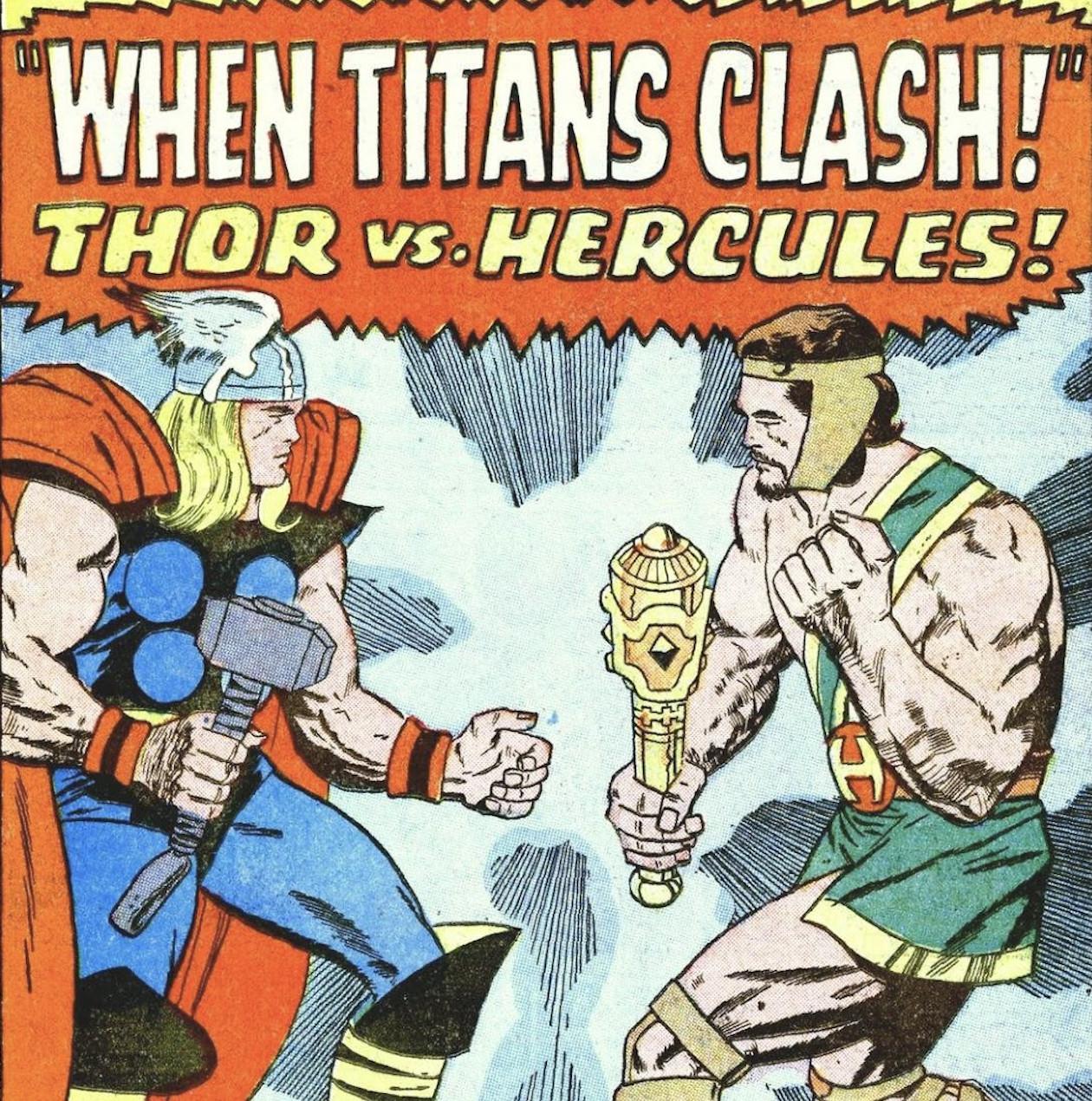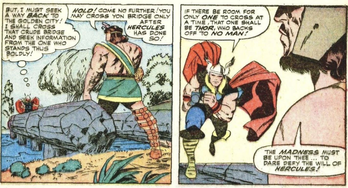 Billed like a boxing match, the two heavyweights face off against each other for the first time in Journey Into Mystery Annual no. 1, when Thor makes a visit to Olympus. They’re alike in many ways, not only in their royal parentage but also because the strong-armed, quick-tempered egomaniacs are always eager to show off their fighting prowess when opportunities arise. Their fight in this instance erupts over the important matter of who gets to cross a bridge before the other: