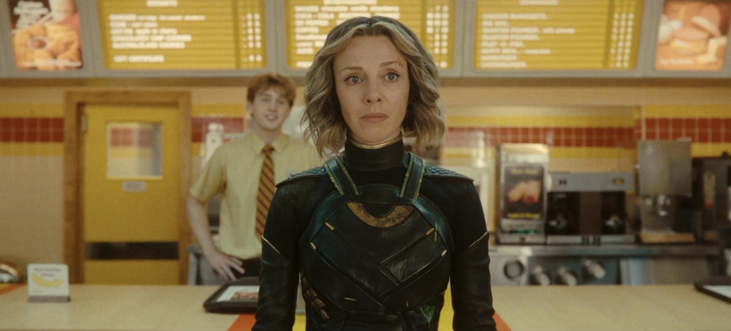 After taking in a breath of fresh Oklahoman air, Sylvie walks into a McDonald’s, of all places, and with dried blood still on her face, she steps up to the counter to order. But as she tunes out the cashier while he describes all the menu options, she looks around and sees customers laughing as they enjoy their meals and each other’s company. (It should be noted that Sylvie first asks for “something that’s already dead” and “nothing with a face.” This woman has had a rough life.) It all feels like a rather ridiculous bit of sponcon that paints McDonald’s as some sort of idyllic symbol of freedom. At the same time, there’s something tragic about how much this fast-food venue (and the simple lives its patrons seem to be leading) represents what Sylvie lost the chance to have after being taken by the TVA as a child.
