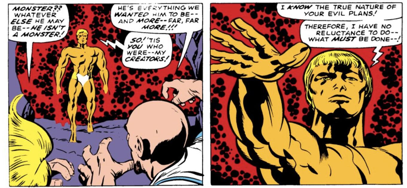 In the comics, Warlock was similarly genetically engineered for perfection in a cocoon-like birthing chamber, but by a group of human scientists known as the Enclave. They named their creation, even more simply, “Him.” This iteration of the character made his brief debut in Fantastic Four no. 67 in 1967, but as is often the case in superhero comics, he received a significant revamp several years later, when he appeared in Marvel Premiere no. 1 in 1972.
