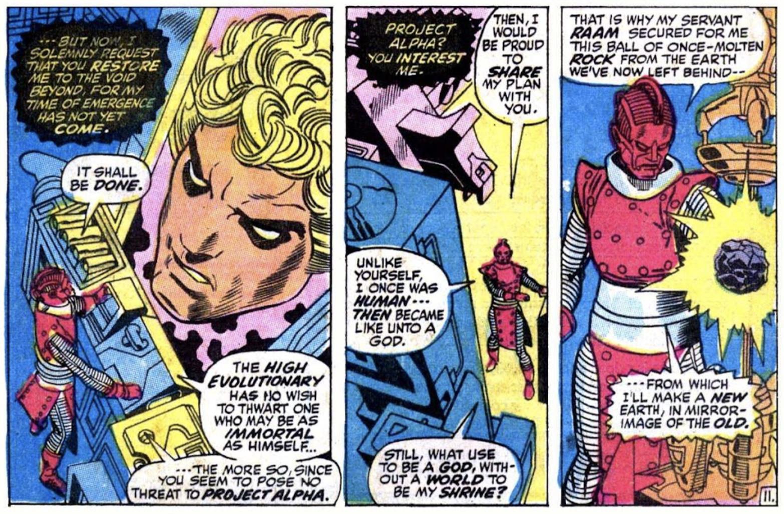 Written by Roy Thomas and Gil Kane, this issue brought Him (who had returned to his cocoon) together with the High Evolutionary, a human geneticist who transformed himself and other beings through science, often evolving animals into humanoid forms. The High Evolutionary’s most cherished experiment was Counter-Earth, an idealized planet he formed from an asteroid in the image of Earth, free from the original’s many corruptions. However, after his plan for creating a utopia went awry, the High Evolutionary bestowed Him with the Soul Stone and provided Counter-Earth with its first hero and protector.