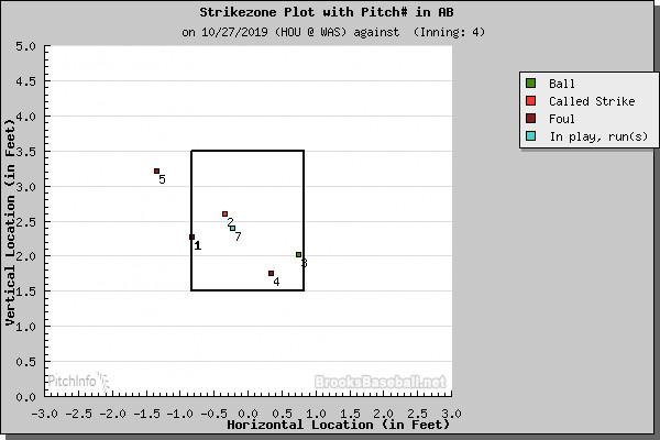 With Scherzer down to one working arm—unfortunately for the Nationals, the left one—Martinez had to hand the ball to Joe Ross, who was added to the World Series roster after failing to make the cut for the wild-card game, the NLDS, and the NLCS. Entering Sunday, Ross’s two scoreless innings in Game 3 represented his only in-game work since September 29. On the bright side, Ross was on a roll before the postseason started: After joining the rotation for good on August 2, he recorded a 2.75 ERA in eight starts down the stretch. But a look at a larger sample exposes how huge the drop-off is from a healthy Scherzer to Ross: Of the 313 pitchers with at least 150 innings pitched from 2017-19, Scherzer’s park-adjusted ERA ranked eighth-best, and best among starters; the oft-injured Ross’s ranked 38th-worst.