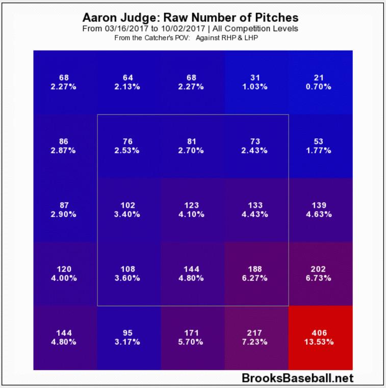 During the season, the most popular place to pitch Judge was low and away. Brooks Baseball tracks pitch location on a 5x5 grid, and of those 25 squares, the three that got the most traffic were the very bottom right corner, the box immediately above it, and the box immediately to the left. Those three spots accounted for 27.5 percent of the pitches Judge saw.