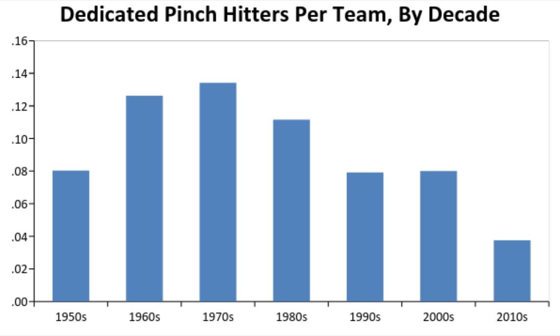 The graph below displays the number of dedicated pinch hitters — defined as hitters with at least 75 PA in a season who made at least half of those PA as pinch hitters — per team grouped by decade, going back to 1953, when Baseball Prospectus’s complete pinch-hit splits start.
